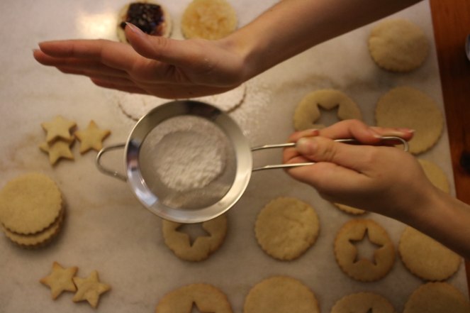 I had to make sure to sugar-bomb the tops of the cookies before sandwiching them with the filling. Didn’t want to ruin the visual effect of the window by having an even coat of sugar over the whole cookie!