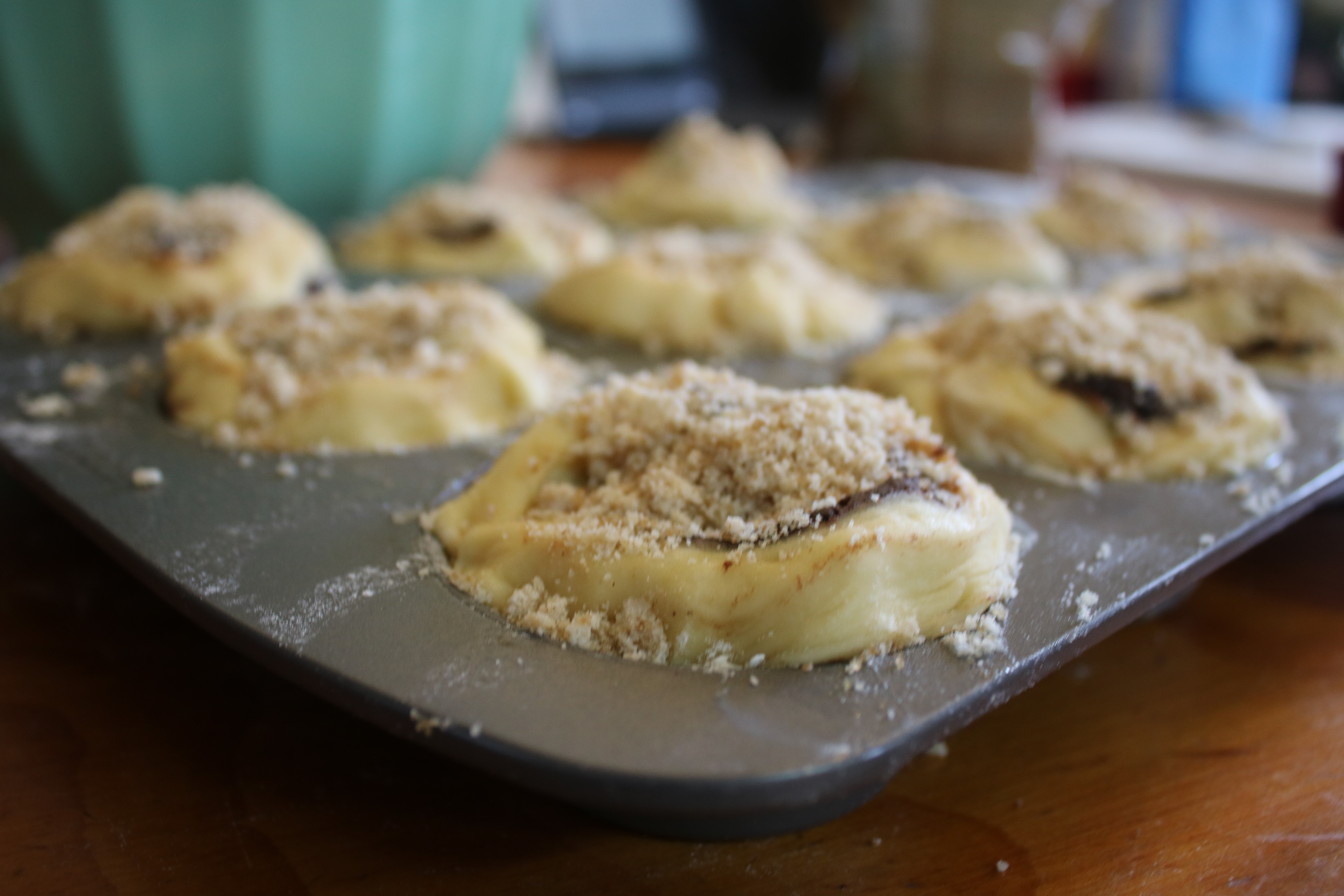 Sliced like cinnamon rolls, snugly fit into muffin tins, and topped with a sprinkle of nutmeg crumble. Ready for the sauna!