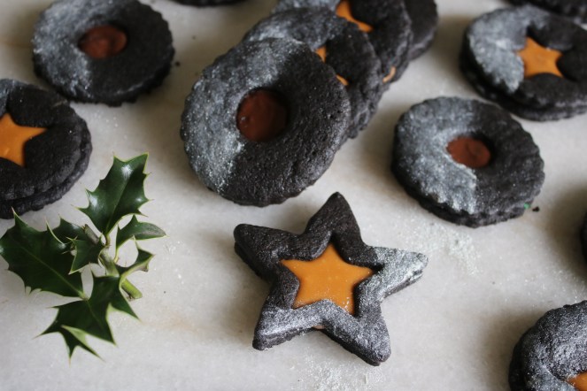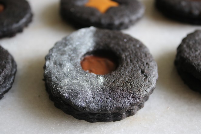 If you want a little background on the Linzer cookie, check out my previous post where I delved into a more classic version. In place of powdered sugar on these babies, I used pearl dust for a shimmery accent. To be honest, the butterscotch spread is sugary enough without adding more for decoration! Along those lines, the cookie dough itself has more of a rich, bitter chocolate flavor. It uses dark dutch process cocoa to help balance out the exceptionally sweet filling.