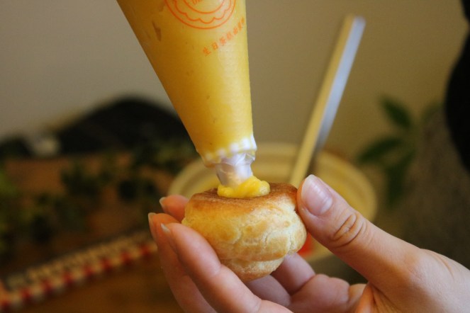 If you have a lovely set of piping tips including the diagonal nozzle, it’s perfect for this step! If not, just poke a hole in the bottom of each puff with a toothpick or knife and then use a ziploc as a makeshift piping bag. No need for fancy tools.