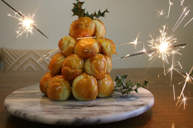 We meet again, shiny tree of profiteroles. Last year’s version was a bit of a mess: choux pastry that collapsed, pastry cream that wouldn’t thicken and caramel that burned all my fingers. I vowed this year to improve every element, and I truly think I did! My mango creme patisserie was the right consistency, the choux pastry held it’s shape and I escaped with only one tiny caramel burn. Plus I found sparklers! Ah sweet, sparkly victory.