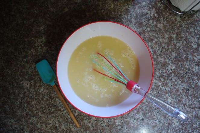 Peek my new whisk! The handle has glitter in it. It’s now best friends with my Mickey Mouse glove spatula. Anywho, in addition to lemon marmalade, I also had a jar of lime curd that needed a new life. I used about 3/4 cup of marmalade, a 1/4 cup curd, and 2 & 1/4 cup water. That’s it!