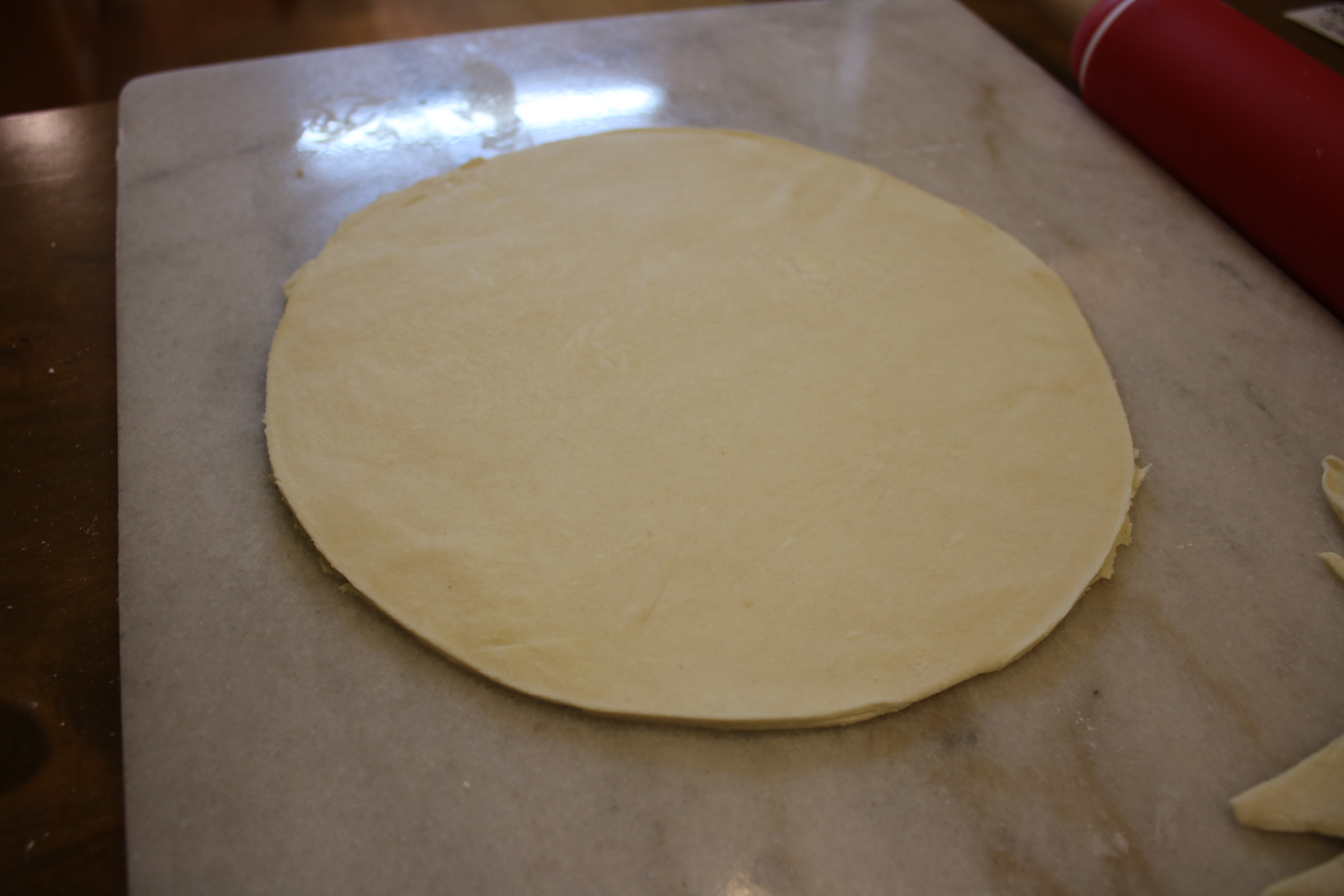After thawing, I rolled it out until it was bigger than a dinner plate. The scraps from trimming it down to a circle are perfect for a little mid-bake snack: wrap a chocolate bar in the bits of extra dough, egg wash it and bake at 425F for 20 or so minutes (or probably a little lower temperature for slightly longer – this was just the temperature I had the oven already at for the galette!)