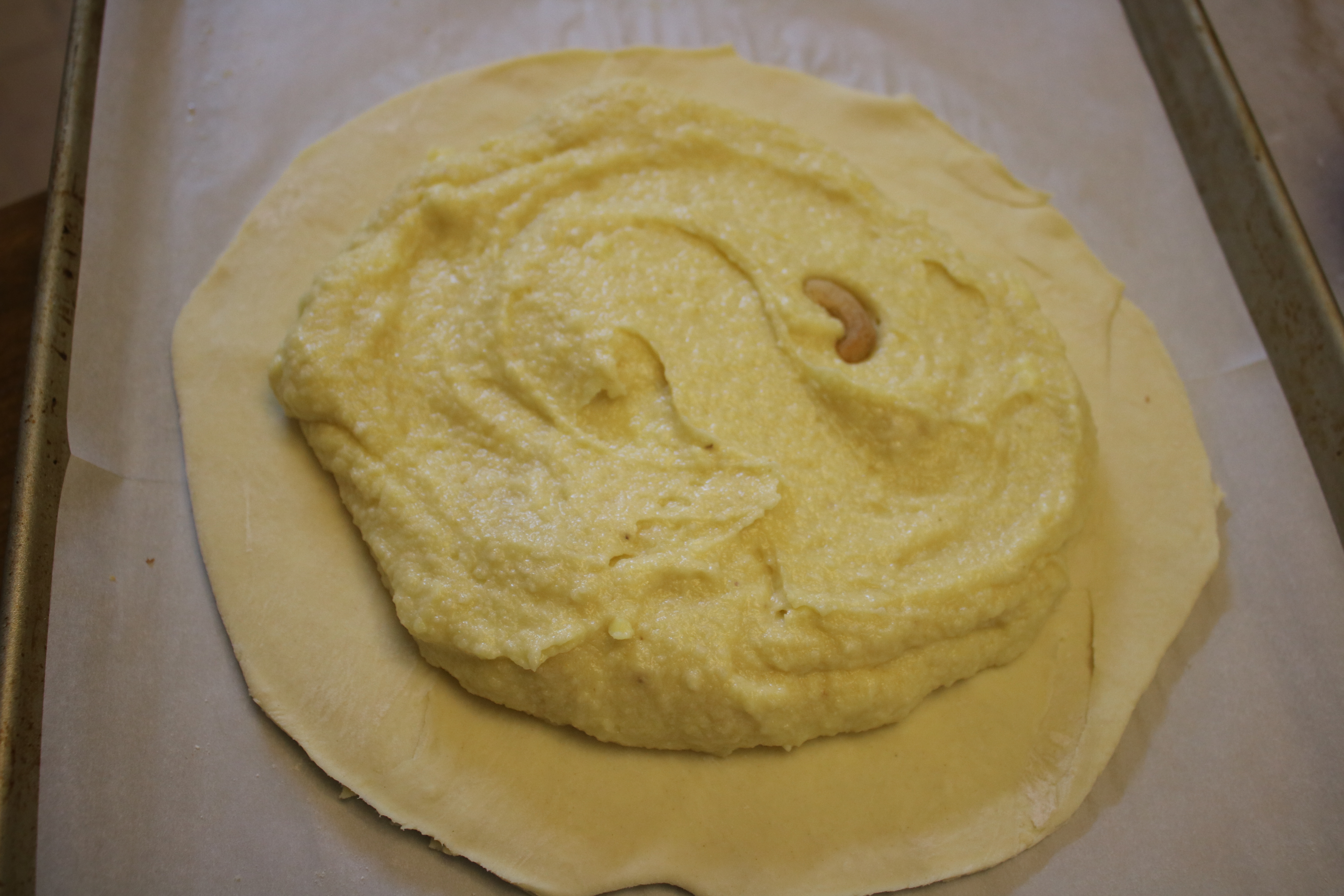 Frangipane added with a flourish! Plus a cashew for a lucky person to find in their slice and become king for the day. Who knew cashews could appoint monarchs?