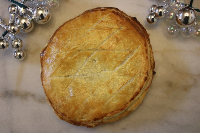 A galette des rois is a traditional treat served on Epiphany. The name appropriately translates to “king’s cake.” The term “cake” technically works, but the definition that hits closer to the mark is “a flat, round pastry.” It’s a fluffy layer of puff pastry, wrapped around a creamy frangipane filling.