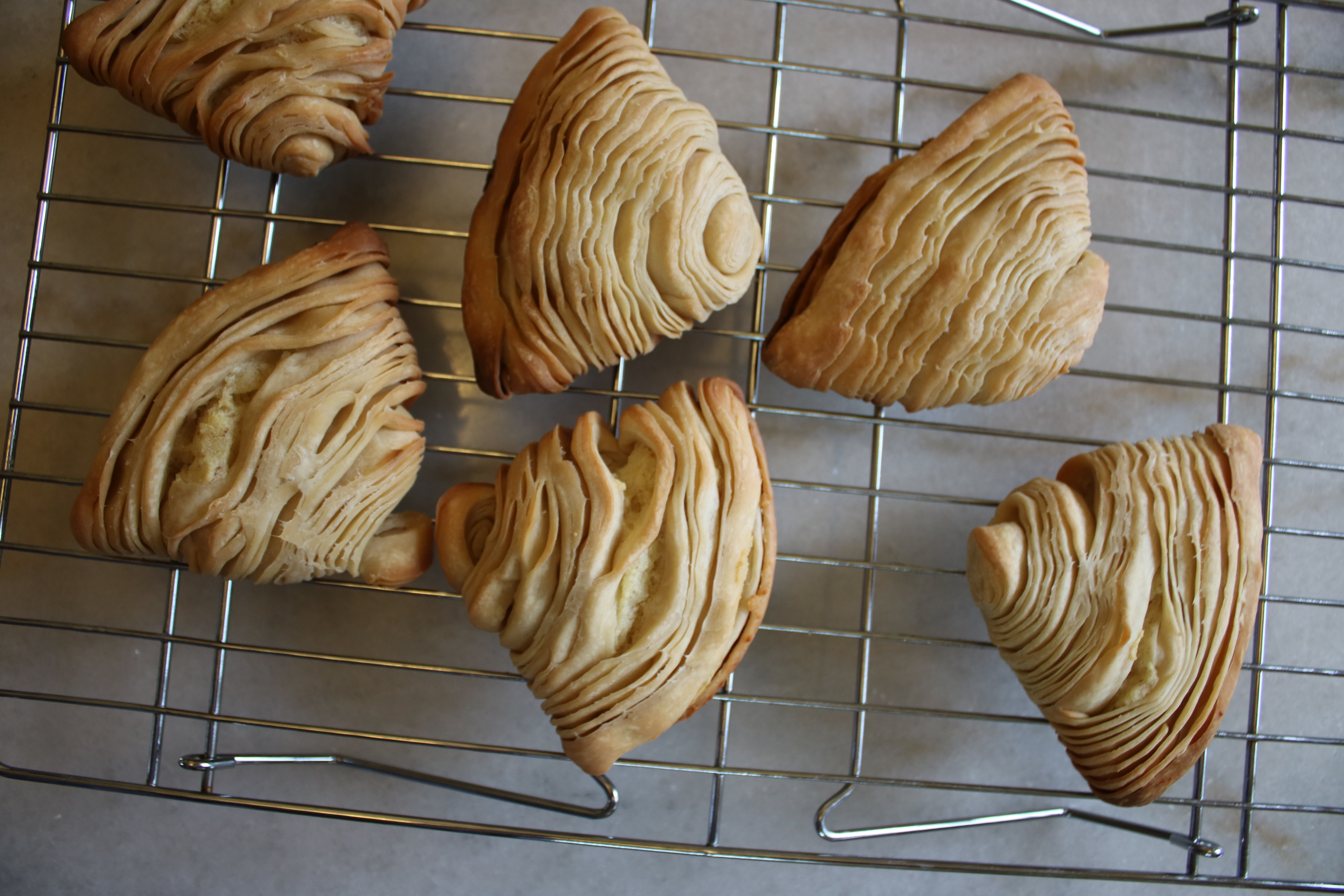 Do you know how to say sfogliatella? 10 points to you if you can! If not, it’s something along the lines of “svol-ya-tell-eh.” I’m not Italian though so take it with a grain of salt. The translation of the name is “puffs” which is adorable. I first learned about them while watching GBBO, and they looked incredibly complex. The delicate layers form a shell shape, or a lobster tail. (Mine weren’t quite big enough to resemble lobster tails, so we’ll stick with shells!)