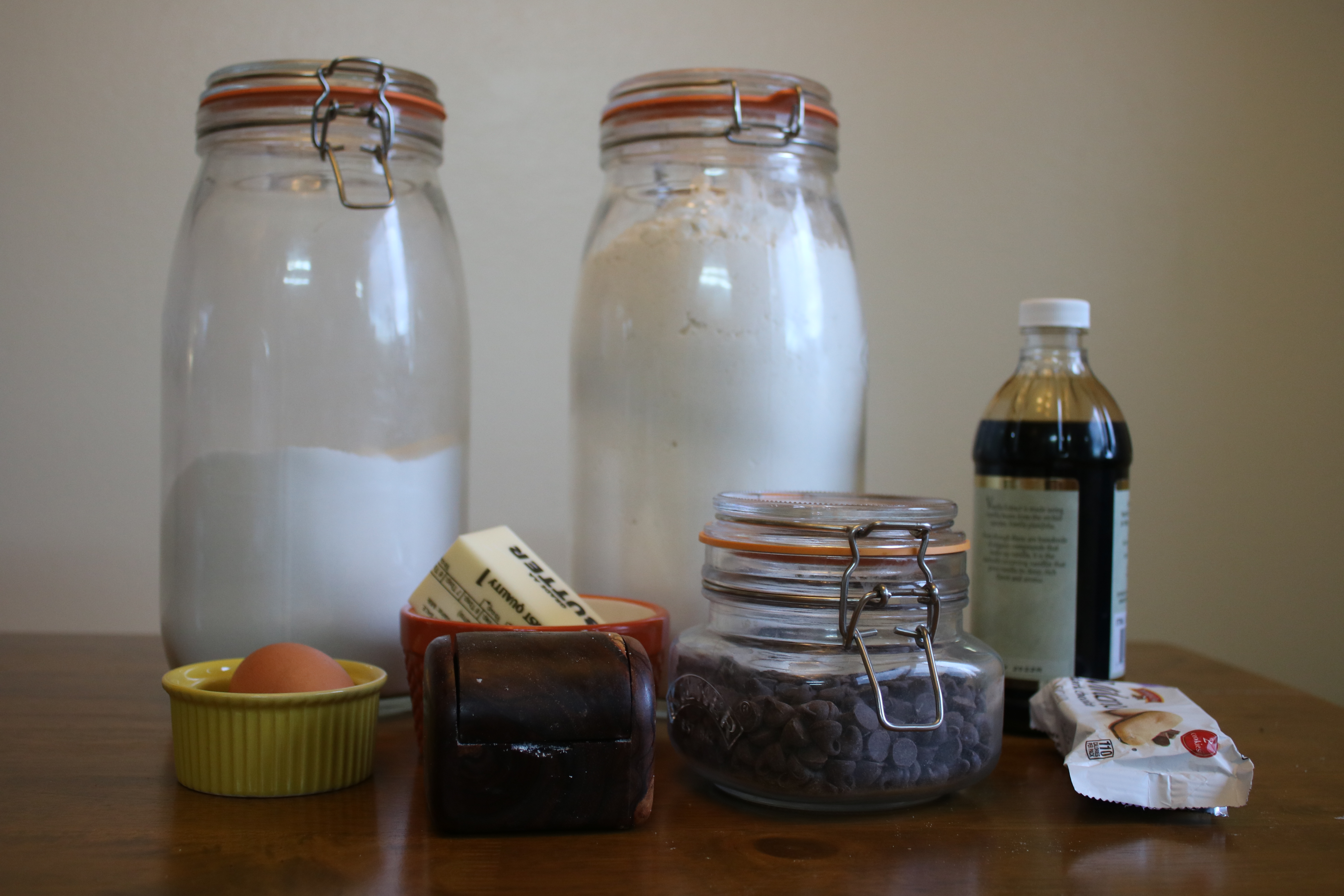 Super basic ingredient line-up: butter, flour, sugar, egg, salt and vanilla. The filling was simply melted chocolate. I happened to have chocolate chips on hand, but next time, I’ll use dark chocolate chunks. Nom.