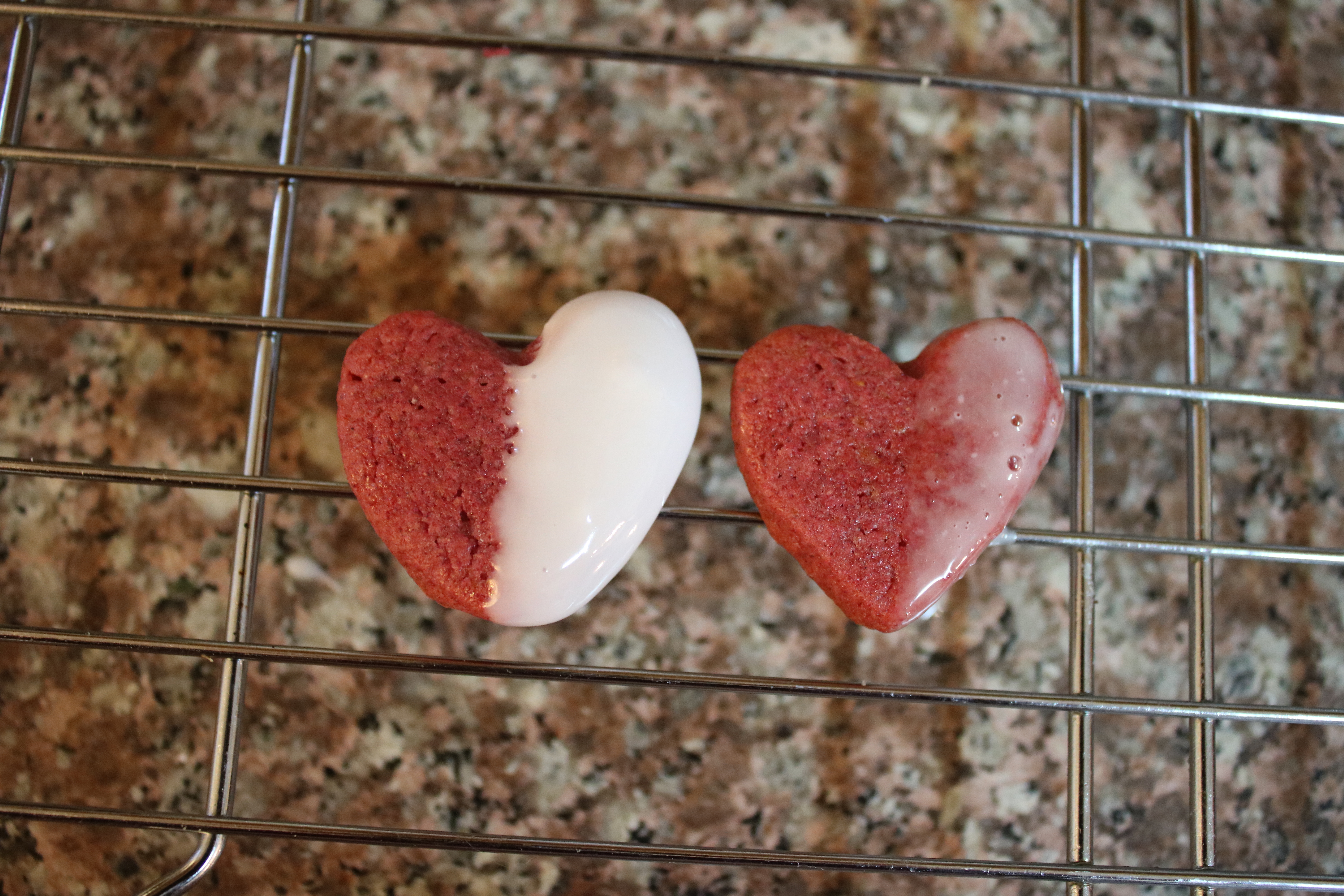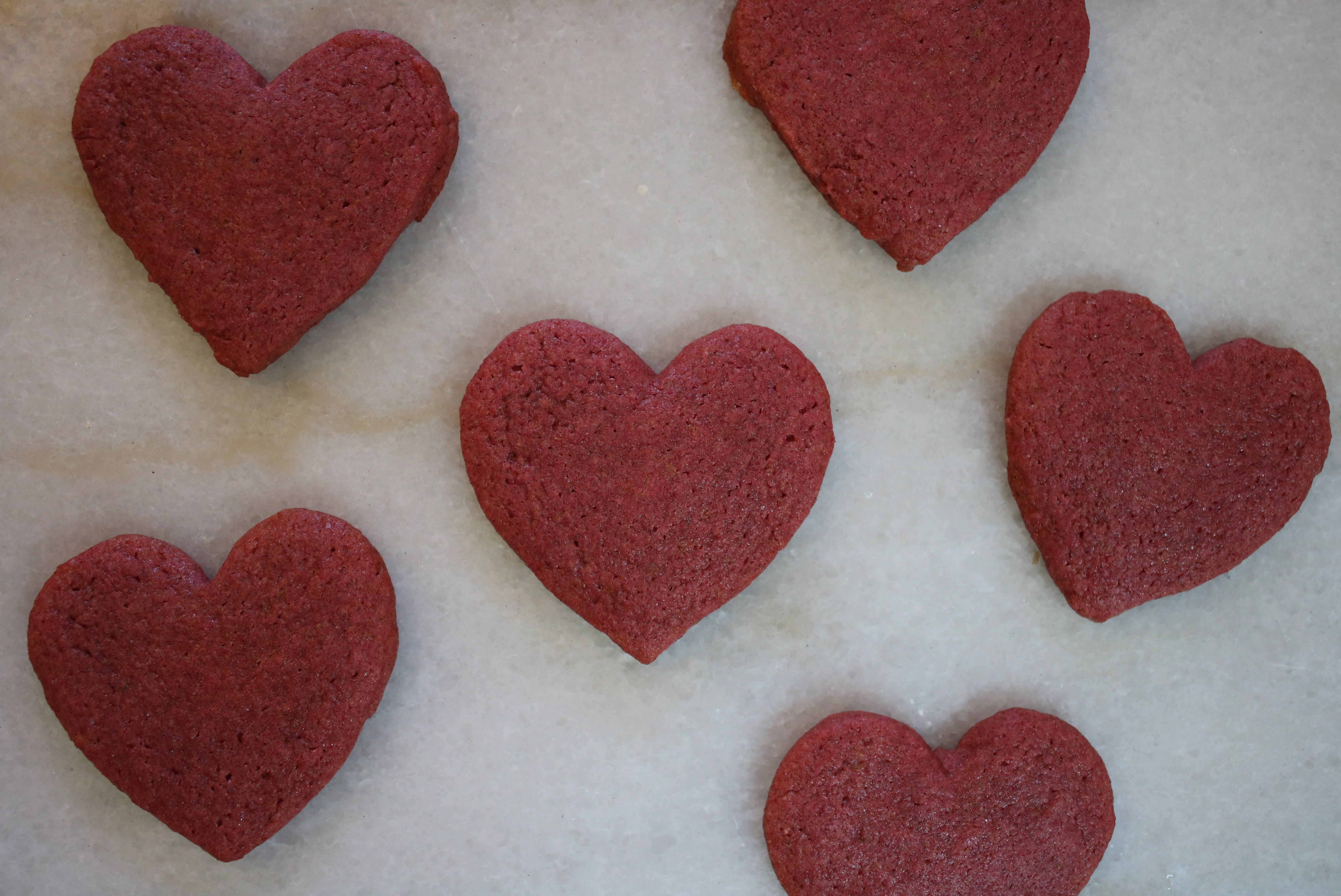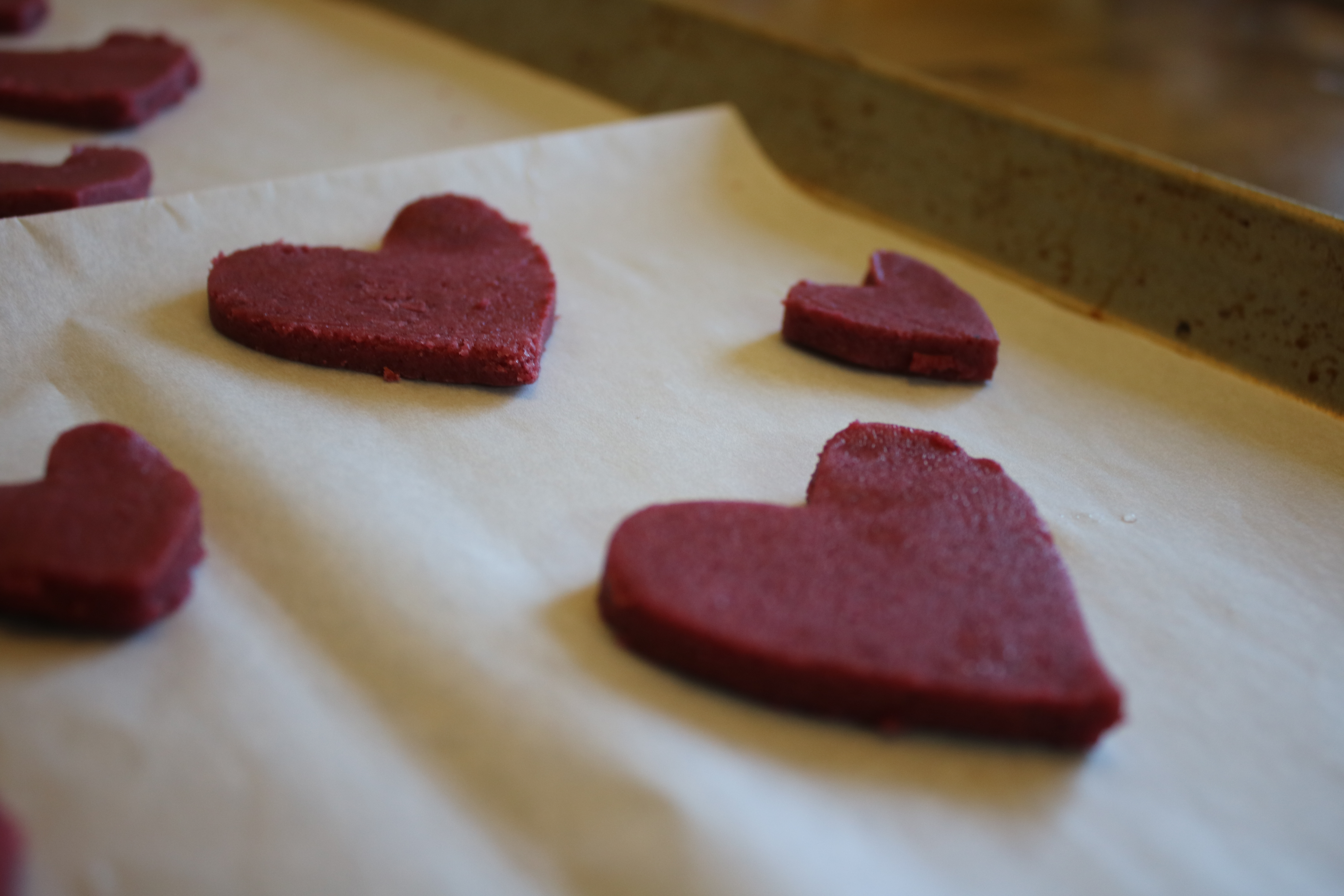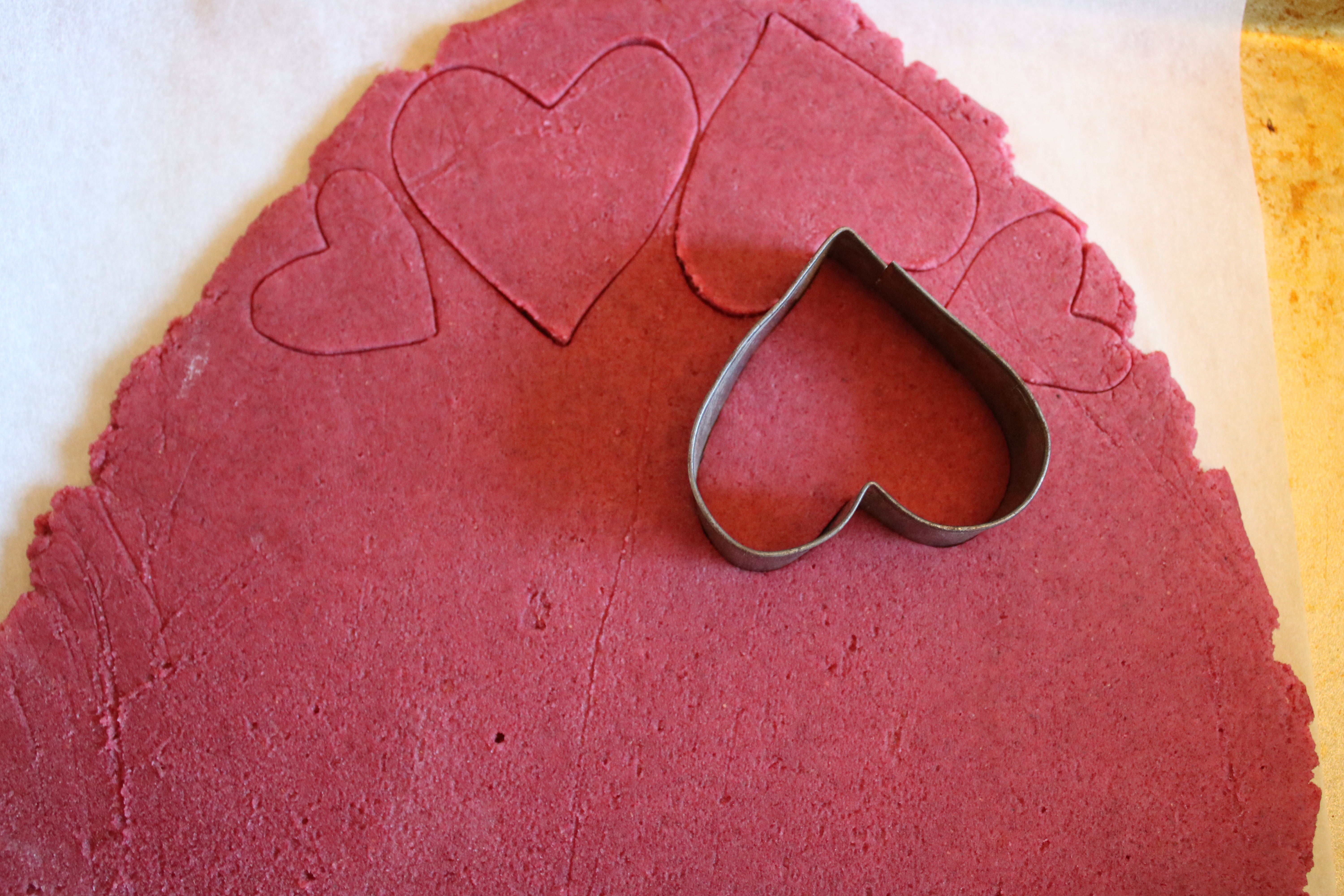 I surprisingly don’t have any heart-shaped cookie cutters. Luckily, I have access to friends’ cookie cutter collections which are better stocked than mine. I ended up only using the two smallest hearts for these cookies so there would be more to go around!