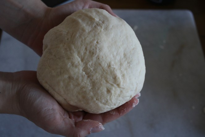 I chose to knead this lump by hand for the fun of it. It’s amazing how this shaggy lump can transform into a smooth, elastic ball in less than five minutes. I generally use the heel of my hand to knead bread dough, pushing away from my body, and then picking it up to repeat the process again at a slightly different angle.