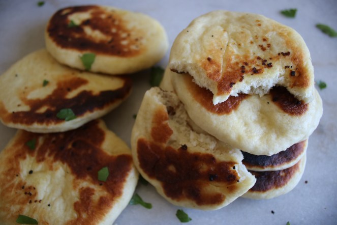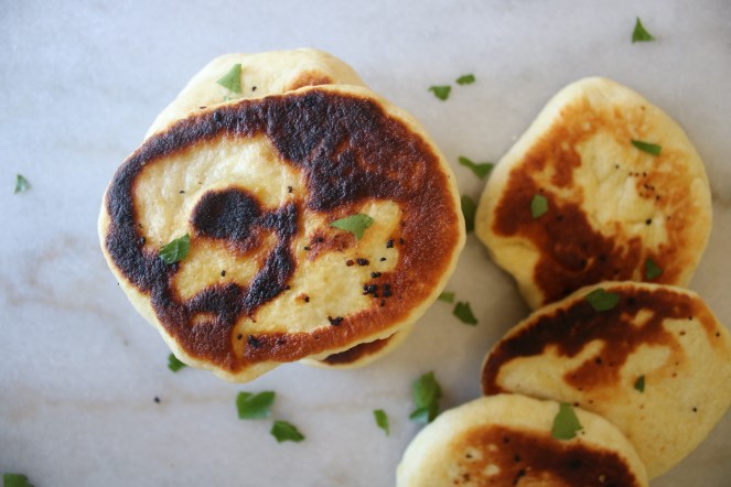 They resemble pancakes and they can be cooked on a griddle, but that’s where the twinning ends. Naan is a simple yeasted dough that puffs up when heat is applied. The dough includes yogurt and milk, and it’s commonly painted with butter and herbs, or stuffed with cheese, right before hitting the skillet. Most articles I read refer to it as a relative of the pita bread, but pita is known for it’s signature air pocket. Naan has some puffy air bubbles, but not one huge pocket that you can stuff a whole gyro into. It’s more of a fluffy carb spoon to get tikka masala and other delicious curries into your face.