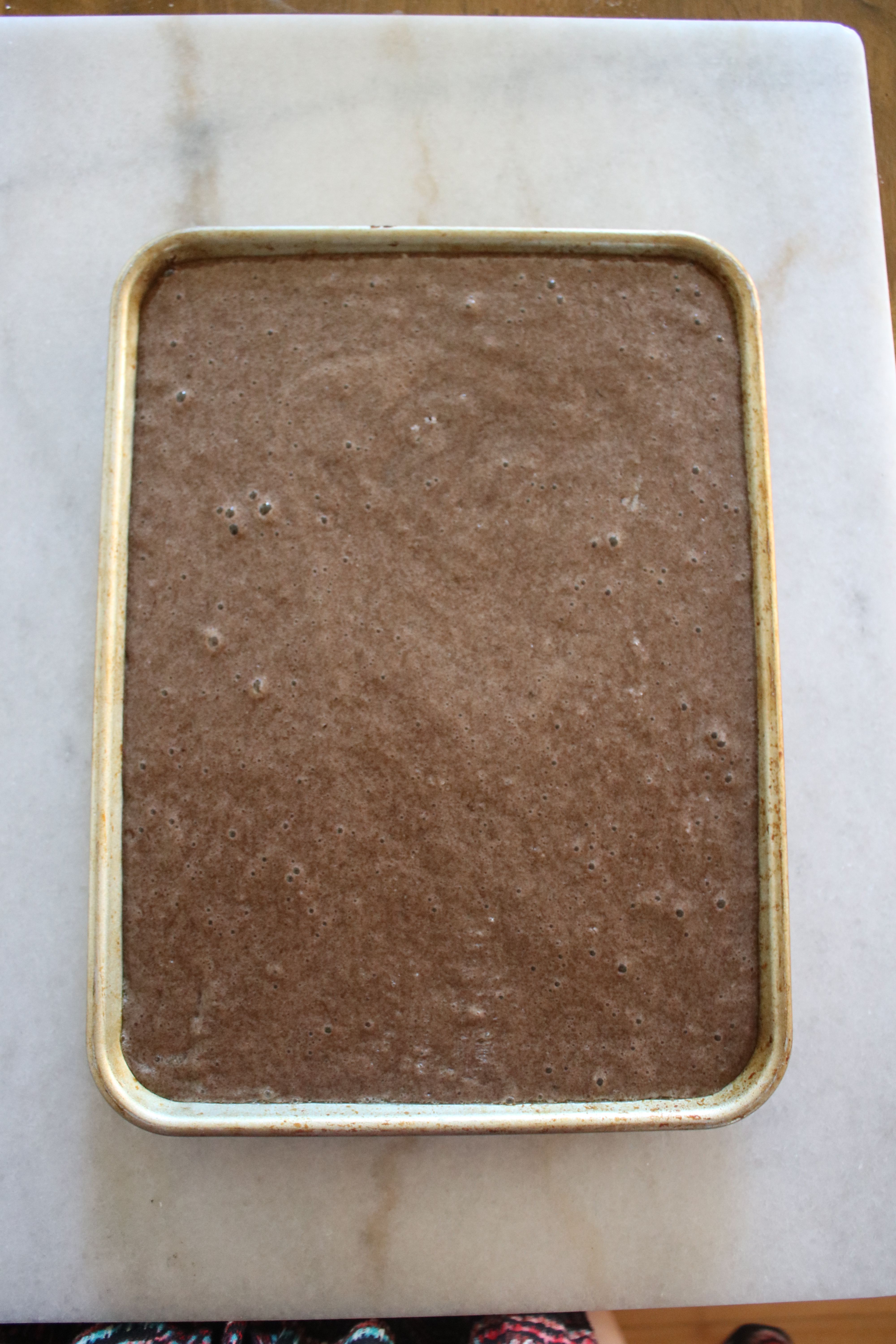 Folded in ever so gently, and smoothed into a parchment-lined pan. Ready for the sauna!