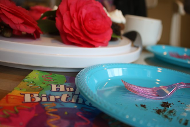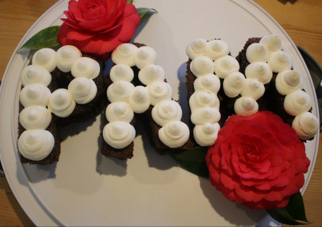 Luckily, my partner’s mom has a short name! It fit perfectly in my cake carrier. The flowers were courtesy of my mother’s yard in Alameda – camellias are the perfect pop of color. My alternative was going to be sprinkles but I went with the fresh look instead.