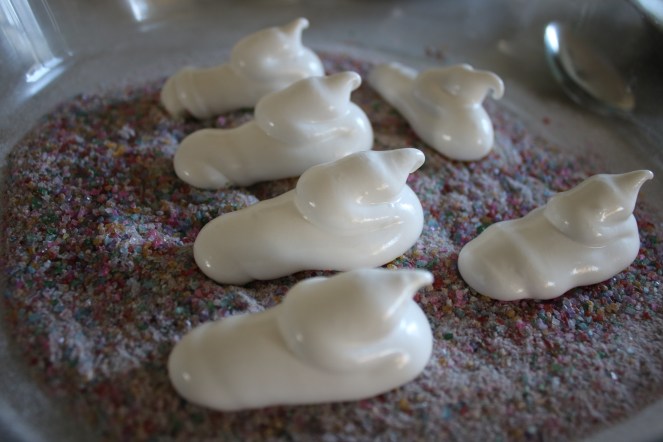 Just some peeps, hanging out. I piped them directly onto the sugar so the bottoms would be evenly coated, then scooped sugar on top.