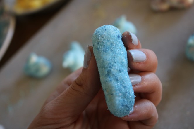 It solidifies within 15-20 minutes, so you want to have your piping bag ready and your colored sugar laid out.