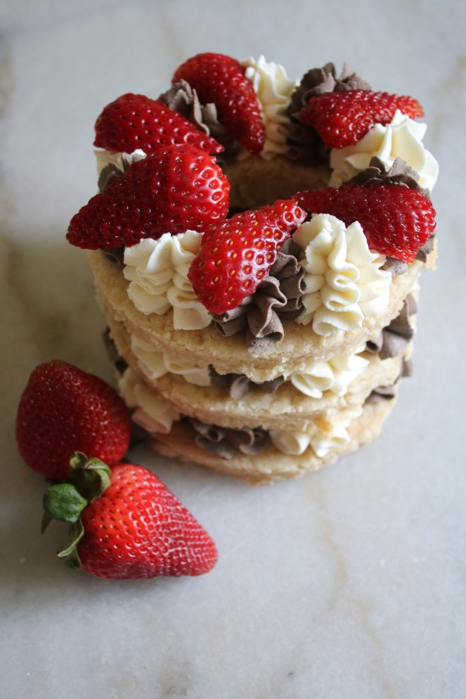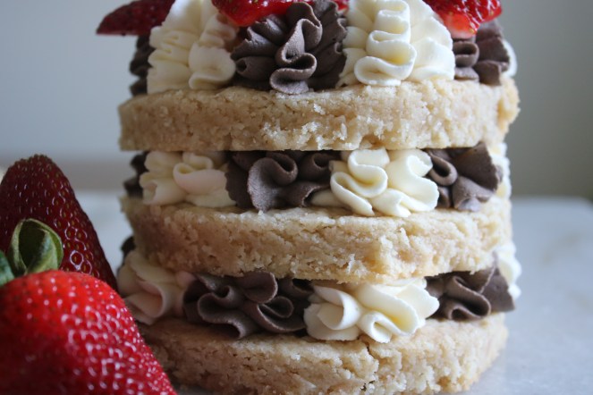 The frilly layers are vanilla and chocolate mascarpone whipped cream, sandwiched between a buttery shortbread. I’ve been dreaming of making classic strawberry shortcake for a few weeks, but I also wanted to make a shortbread version of the letter cakes. My indecision resulted in this gravity-defying tower and I’m not complaining.