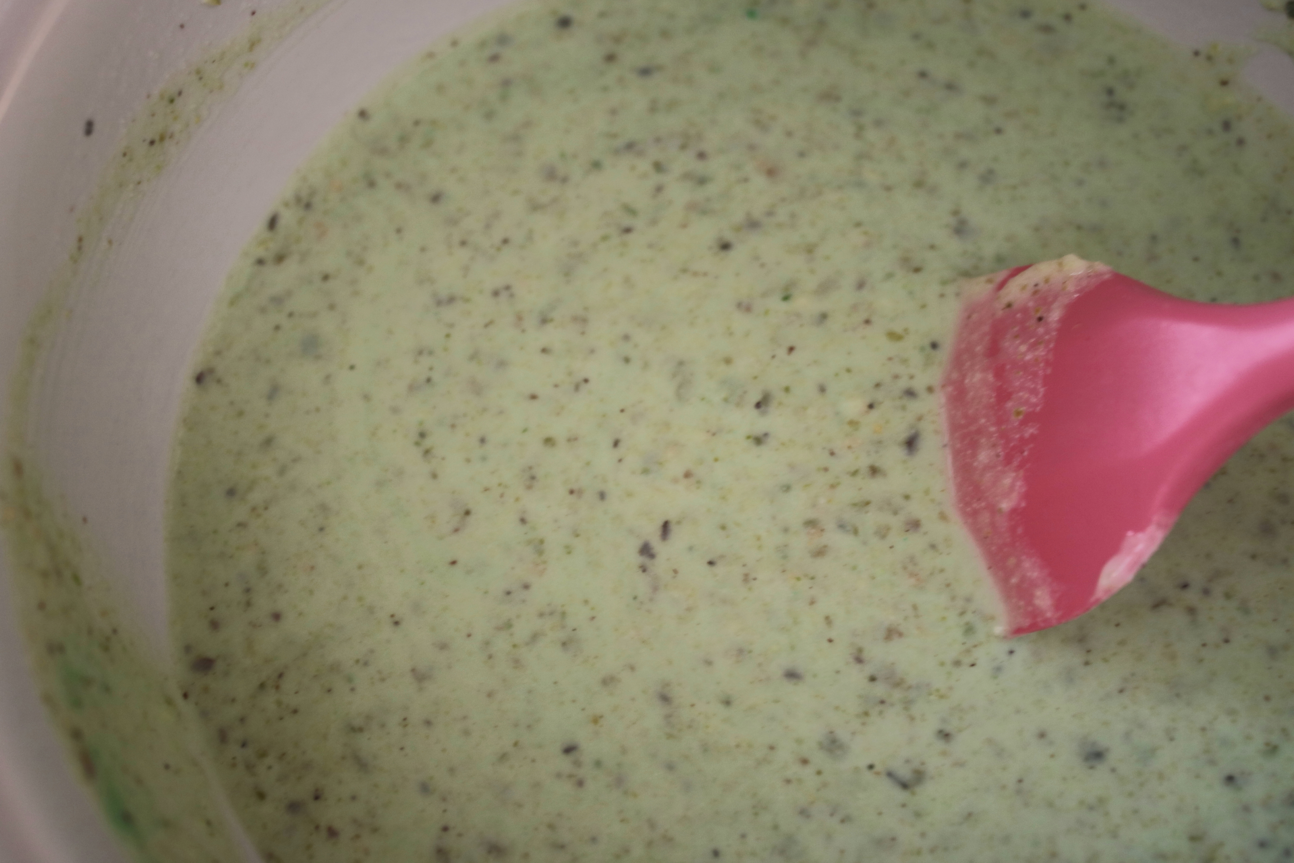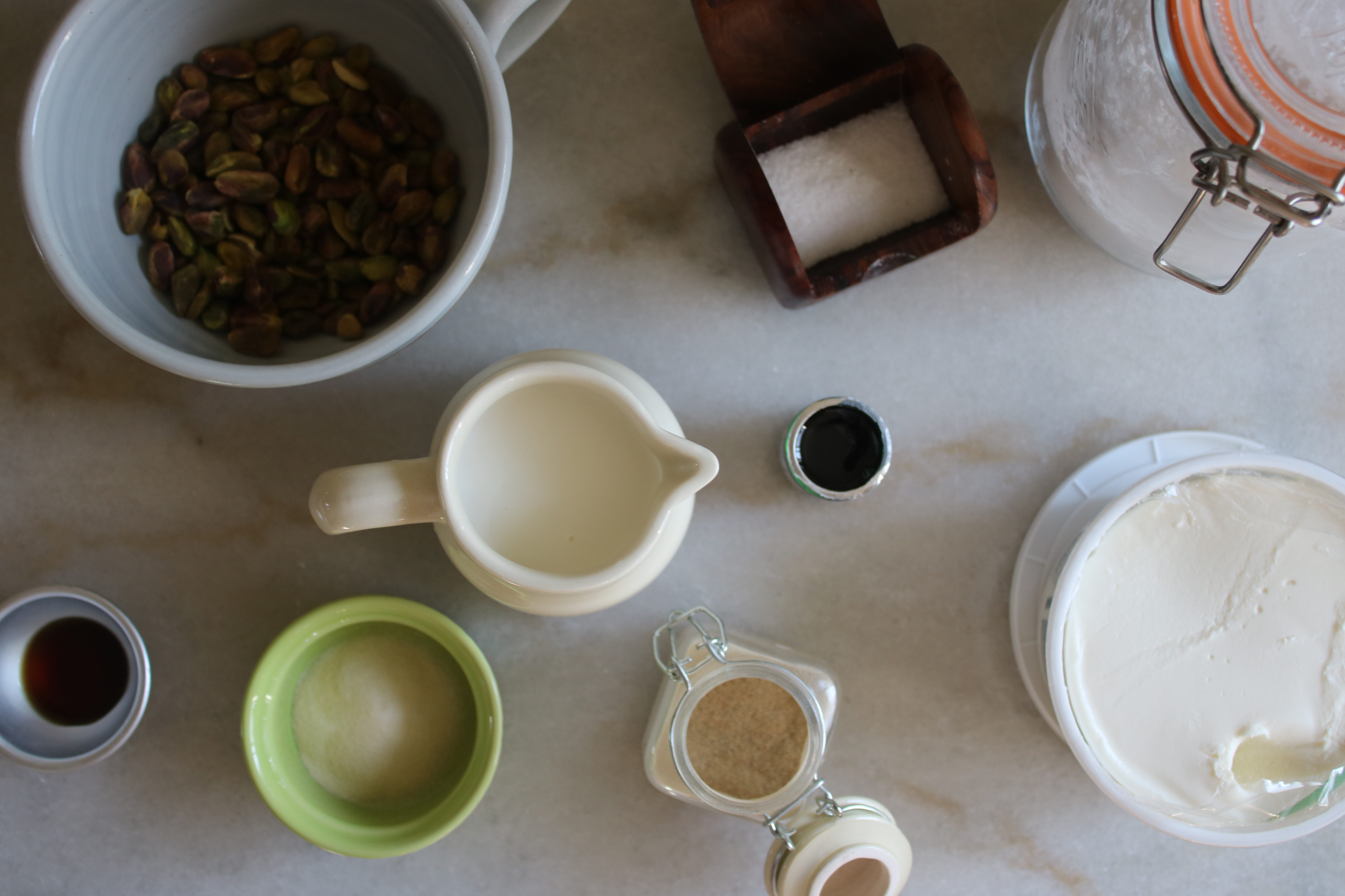 I blended whole pistachios with the cream in a food processor, then added just a touch of green food coloring. I wanted the tiniest bit more than the natural mossy green of minced pistachios.