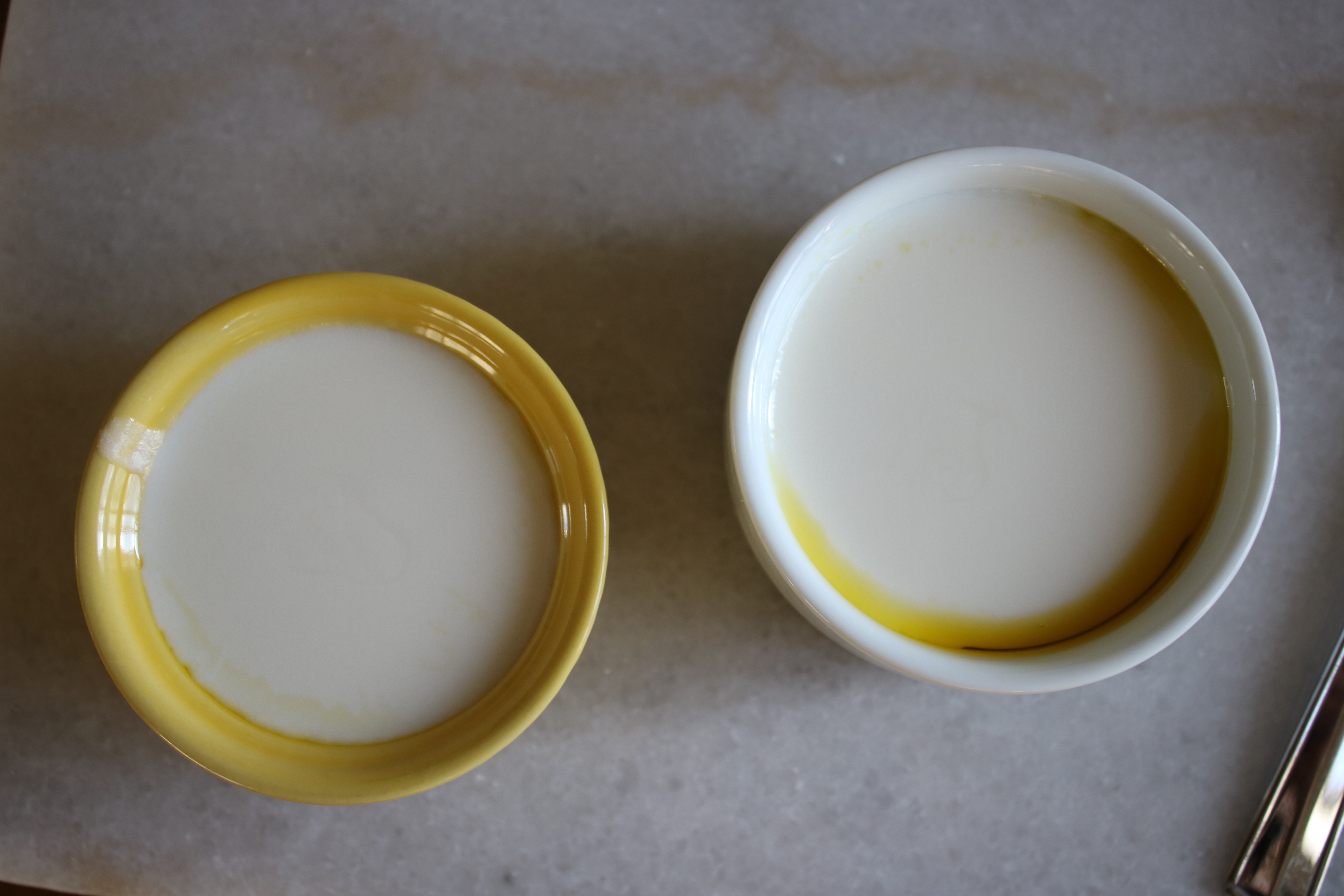 I had some extra ricotta, but no more half and half, so I made a tiny batch of panna cotta with almond milk. The ramekins are lined with orange olive oil (very bougie, very worth it) so they won’t stick when they’re turned out.