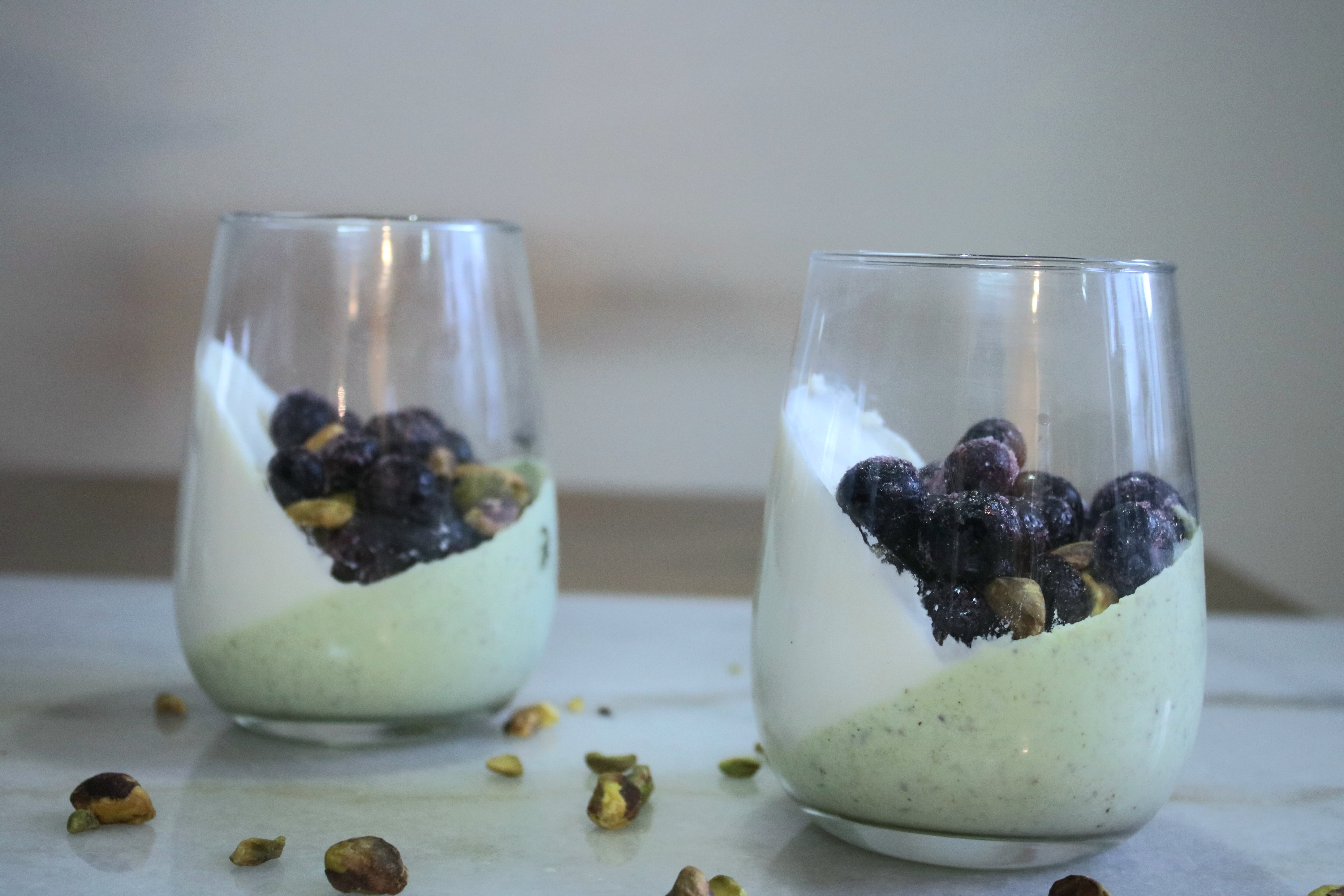 Panna cotta is the perfect blank canvas for a whole host of delicious flavors. I went back and forth trying to decide if I wanted bright and citrusy, or rich and full of warm spices like cinnamon. I tried to hit a middle ground with pistachio and a pop of frozen blueberries on top. I loooove frozen blueberries on everything, or just straight. Recent discovery: frozen peas are just as delish! They’re sweet and refreshing, which is slightly bizarre but mostly great.