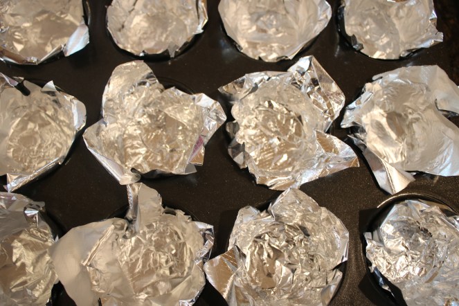 Not wanting to chisel orange jelly out of my muffin tin, I lined the cups with foil. If you have those foil cupcake liners, that would be even easier!