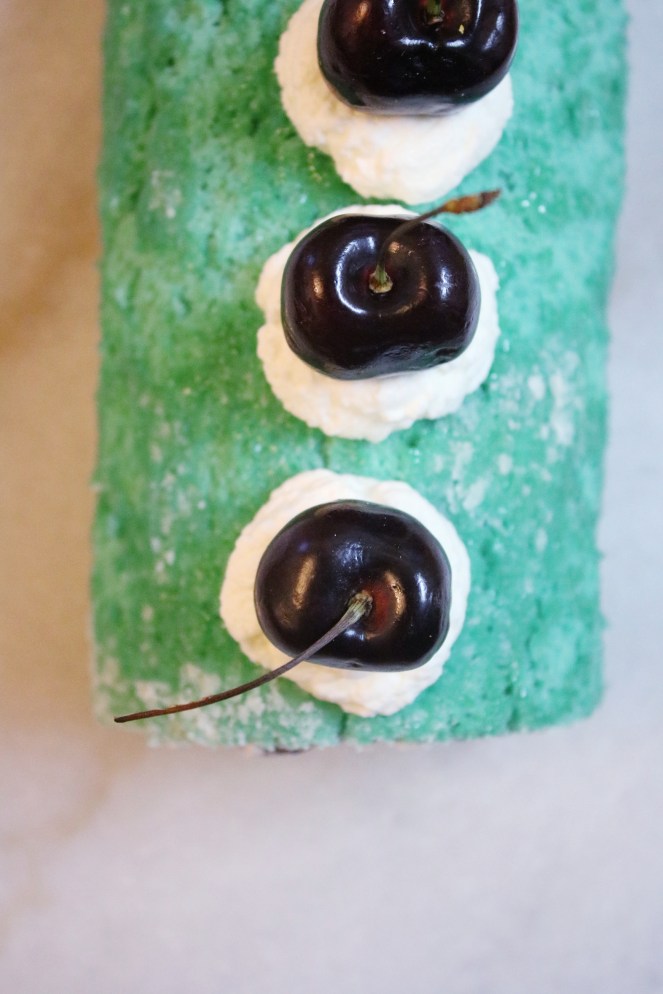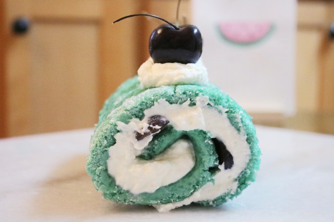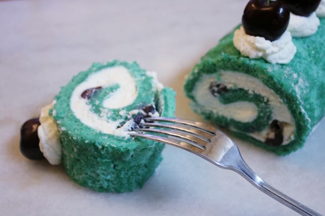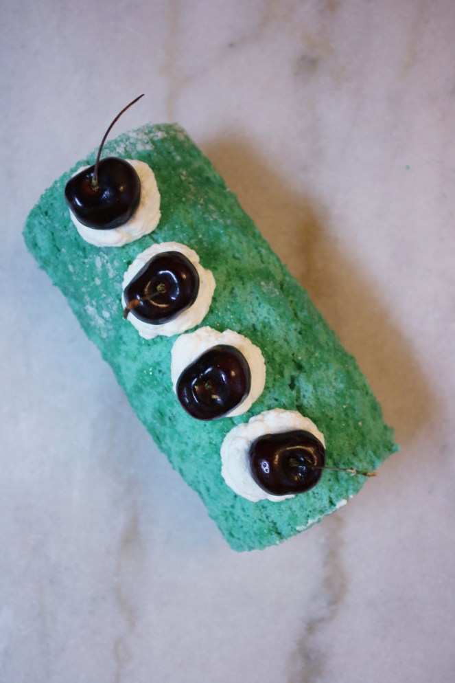I realize that I made a roll cake for 4th of July last year too! My Patriotic Mascarpone Cream Roll was more intricate with the decorations. I went a little simpler this year with a vanilla sponge rolled with whipped cream and fresh cherries. It turned out more of a Tiffany blue, but I’m still happy with it! I’ll post a picture to my Instagram tomorrow of the blue velvet cupcakes I made and hot damn, they are BLUE. We’re talking 20,000-leagues-under-the-sea kind of blue. Jack’s Mannequin would be proud of these cupcakes.