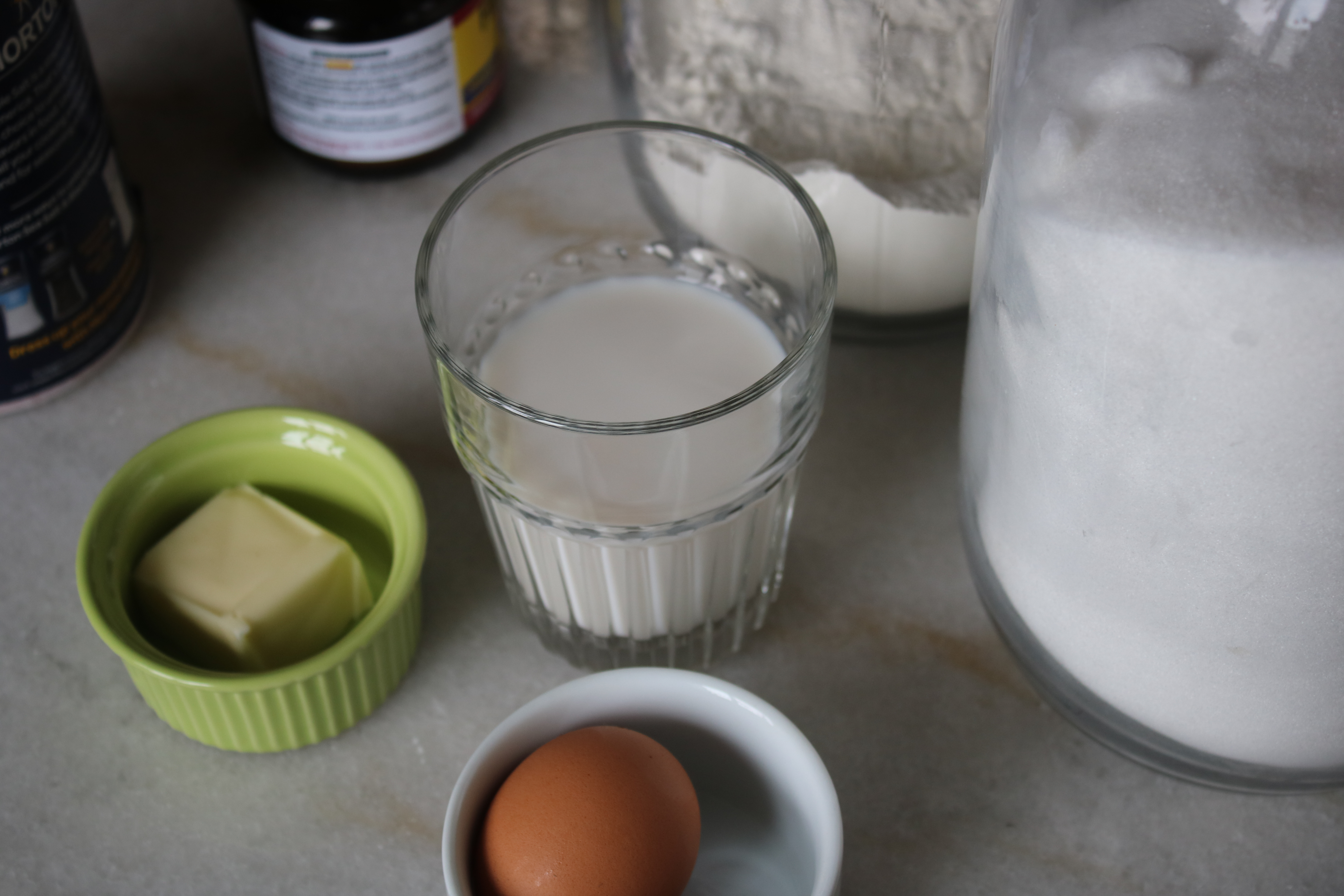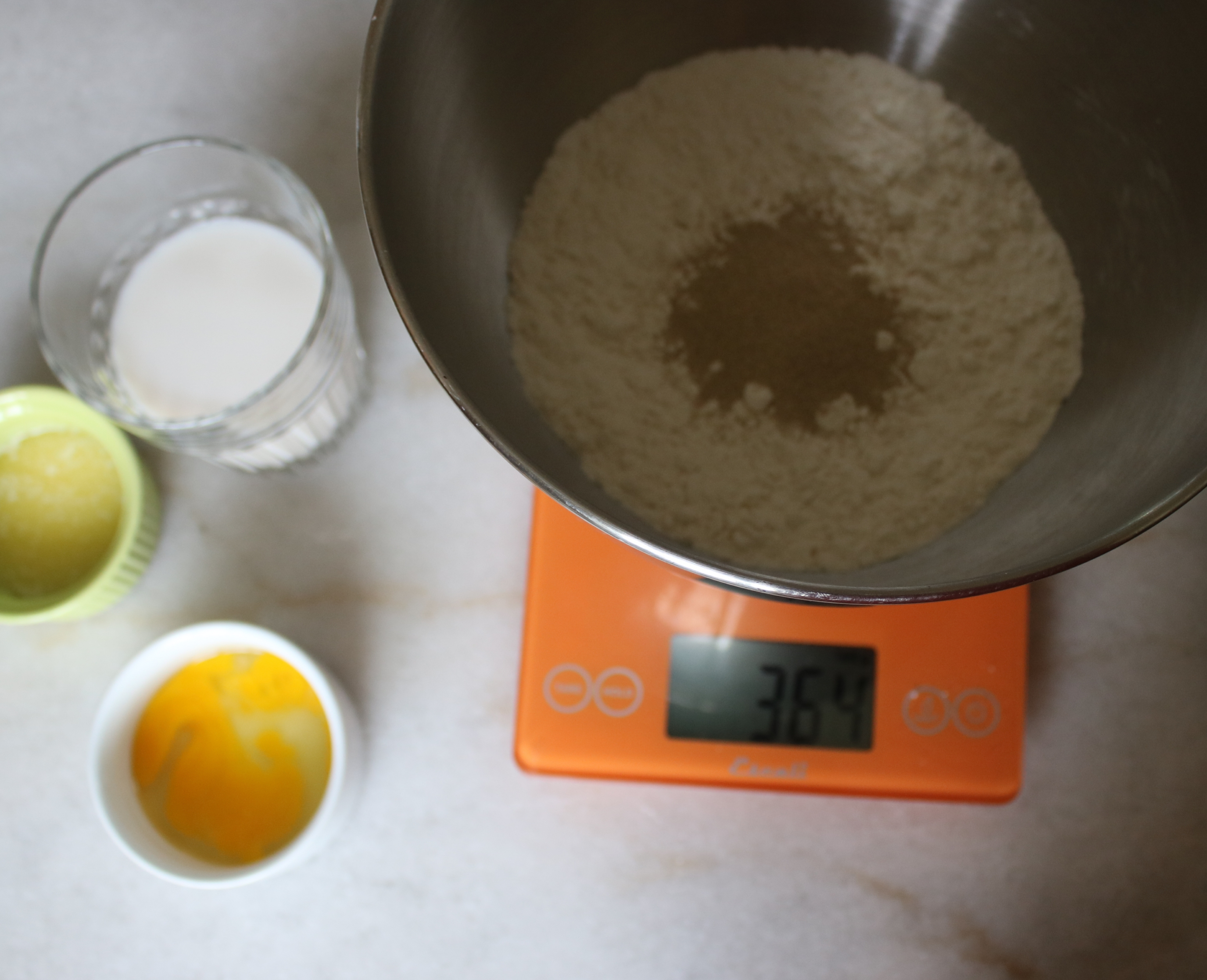 Add in that beautifully portioned out dishes of milk, melted (and cooled) butter and beaten egg.