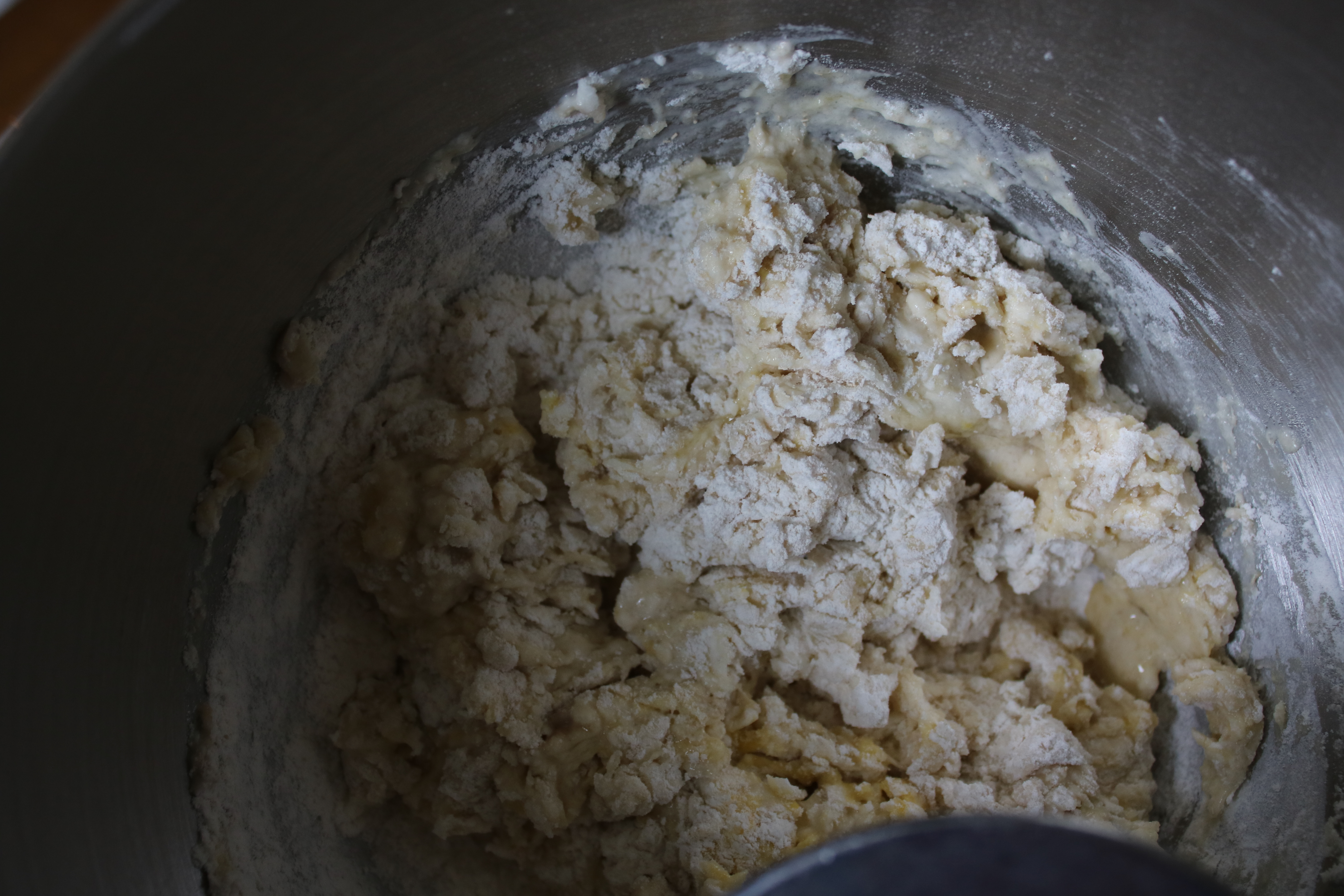 I added a smidge of flour since the dough was more sticky than tacky. My logic is that if you were kneading it by hand, it would pick up and incorporate some of the flour you sprinkle on the board.