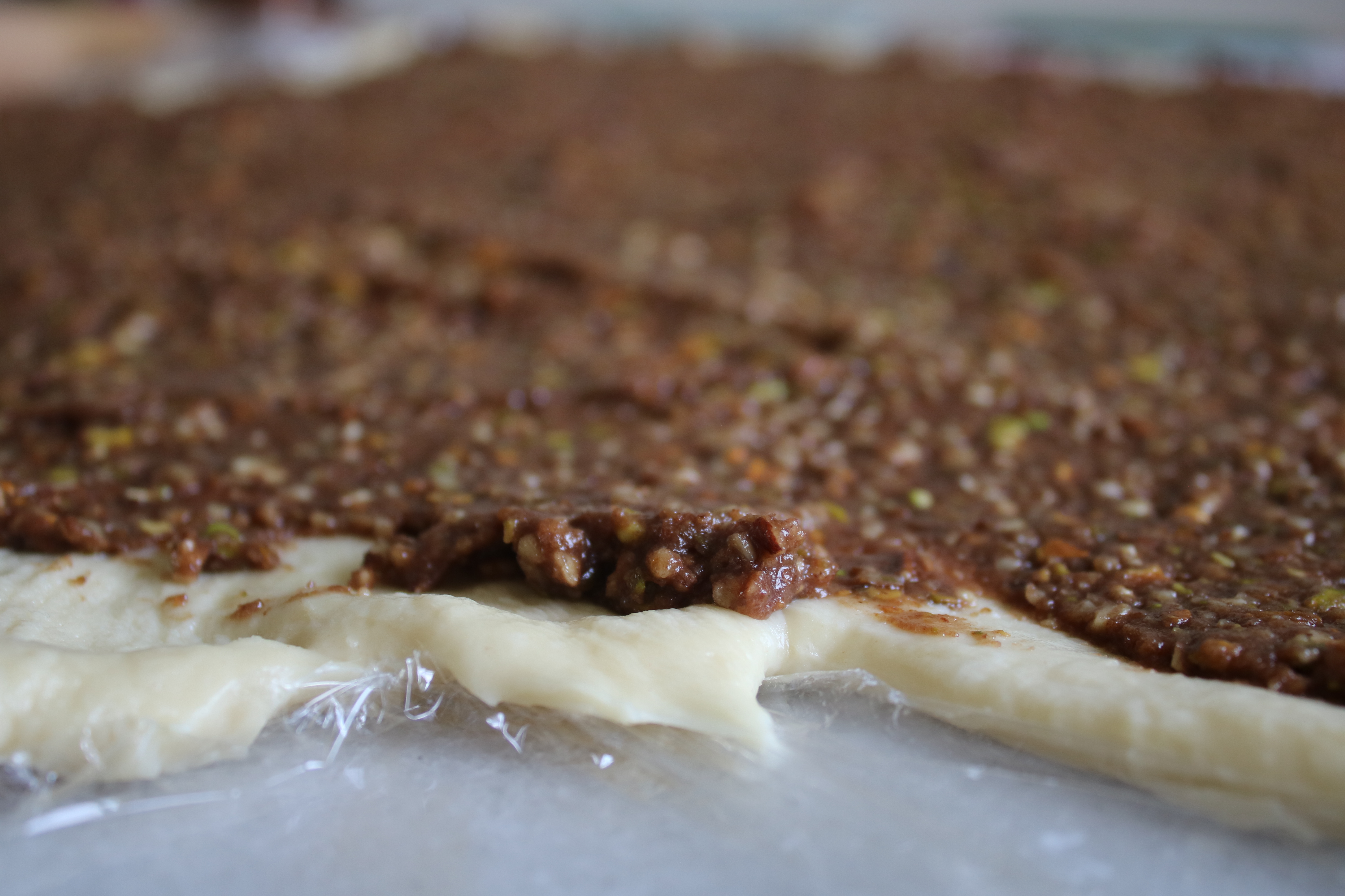 The filling is a quick blend of pistachios, pecans, sugar, cocoa powder and cinnamon.