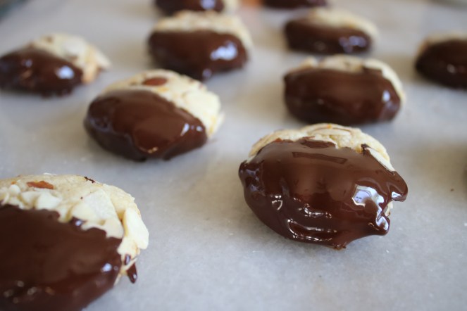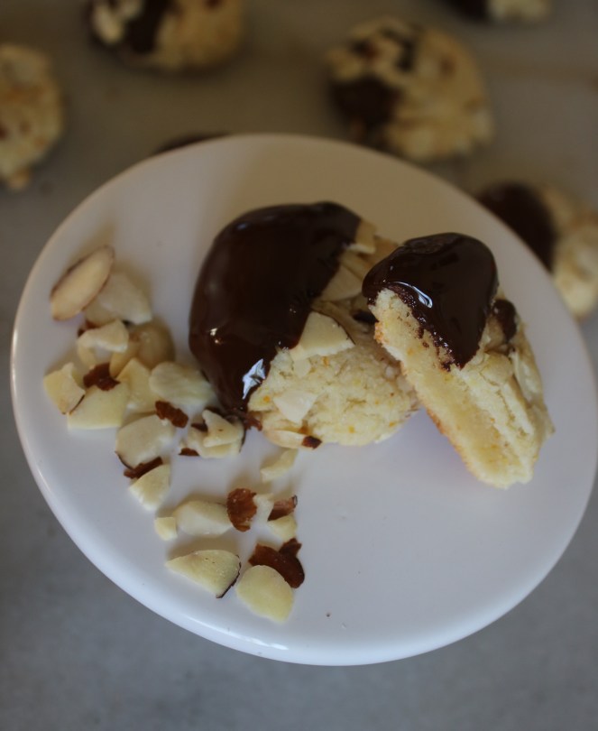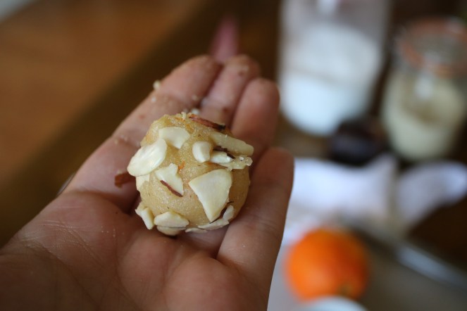 They have the consistency of marzipan in the middle, with a fancy facade of shaved almonds. The dark chocolate coating wasn’t in the recipe, but just seemed natural. I love love love both orange and almond with chocolate individually, so it was a no-brainer to combine all three.