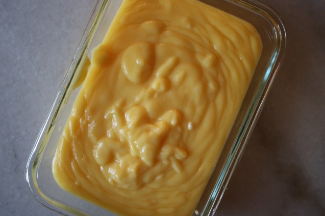 Looks like butterscotch pudding – yum! I strained it through a sieve to reach peak smoothness. Pop it in the fridge and try not to eat it all before you use it in your bake.