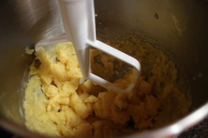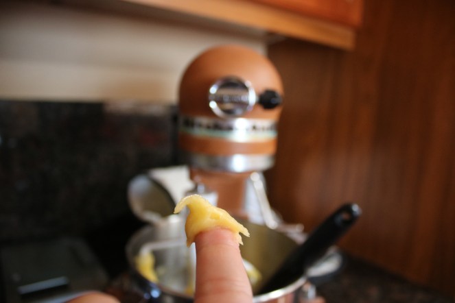 One of the tricks I learned from GBBO is to take a small amount of dough between two fingers and pull it apart. If it tilts over like this, it’s ready to go! If it stays standing upright, add another egg.
