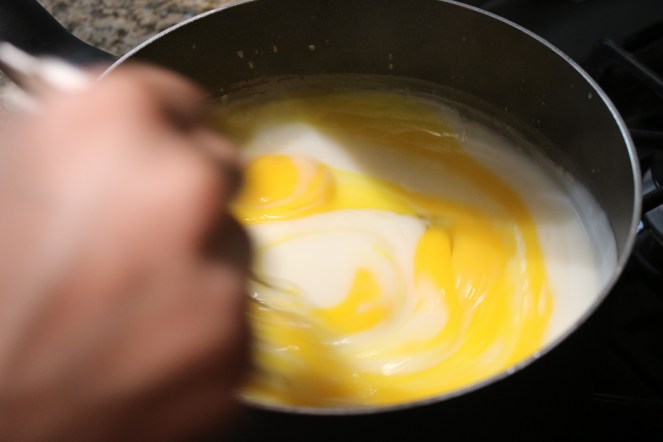 This custard was different than any I’ve made before – it started with a roux like a gravy! Mixed together some milk and flour, added in scalding milk and the cinnamon sugar syrup and whisked like mad over low heat.