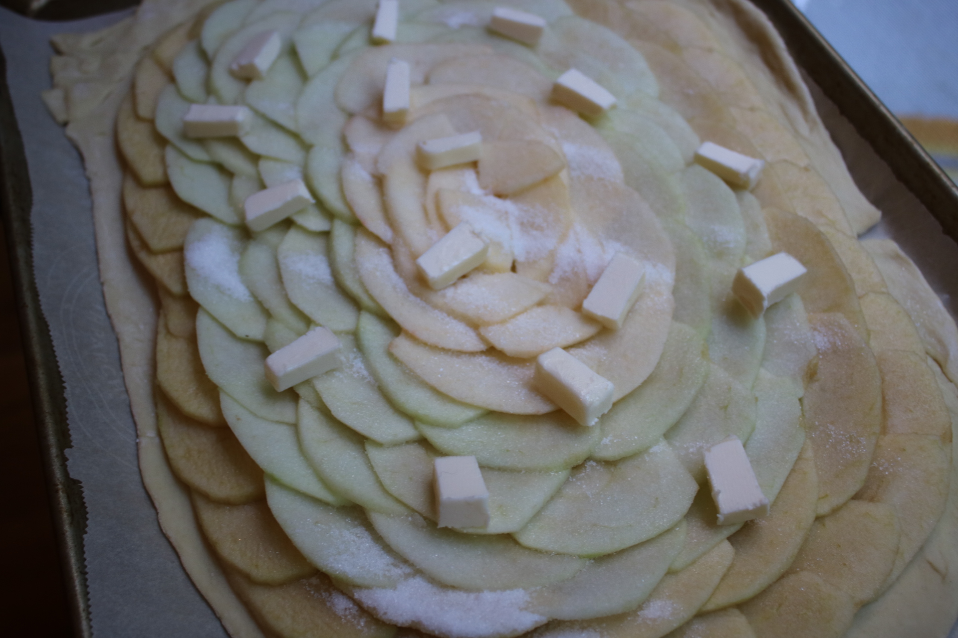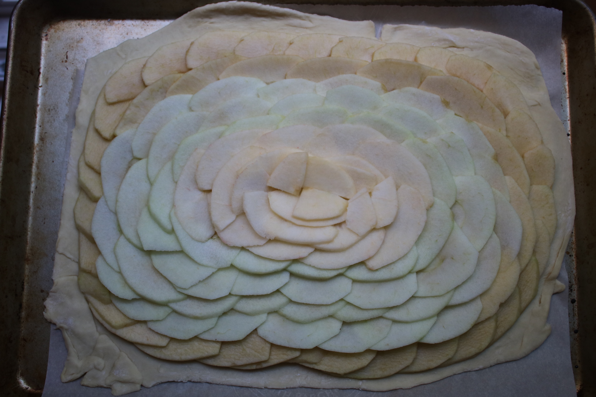 This is the part where you want to work quickly! If you take your sweet time arranging the apples, they’ll start to oxidize before you can bake em.