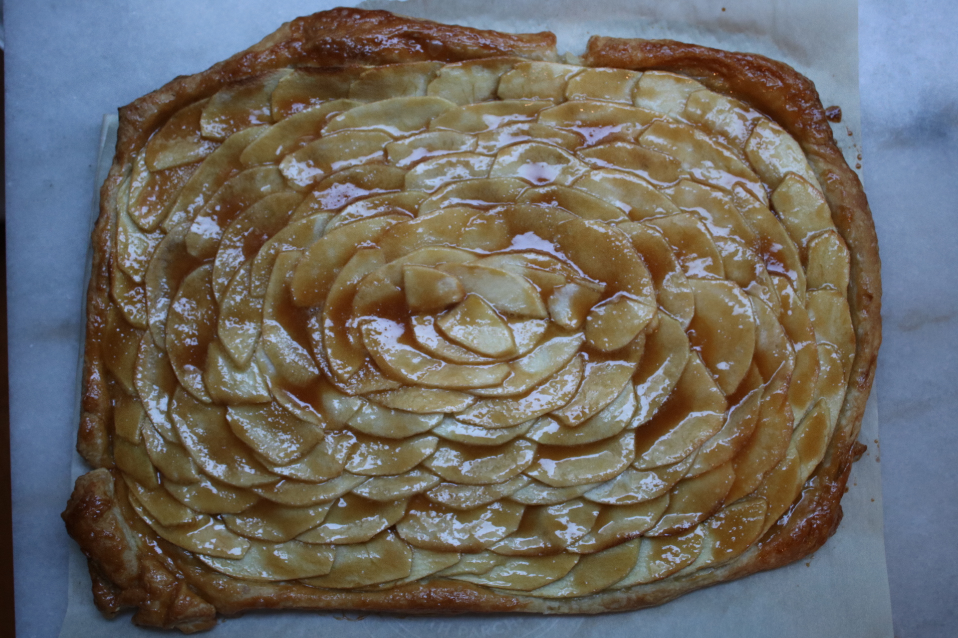 I’ve never had a dessert pizza, but it should definitely be like this. Gooey salted caramel on thin slices of tart apple on a bed of crispy puff pastry.