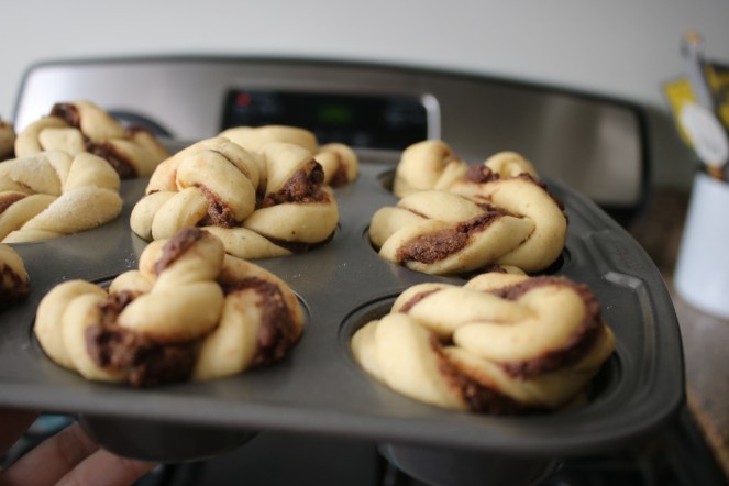 Twirl each double-twisty piece of dough into a muffin tin and tuck the ends into the middle.