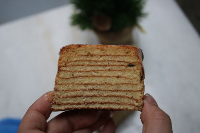 So the crazy part of this recipe is that instead of baking all the batter at once, you broil thin layers of cake one by one. You want to each layer to turn a shade darker than golden so it’ll show up when you cut into the cake! I think it would be really yum with a layer of jam between every third layer of cake – it would definitely help it from being so dry. Oo maybe an apricot jam . . . I’m not drooling, you are!