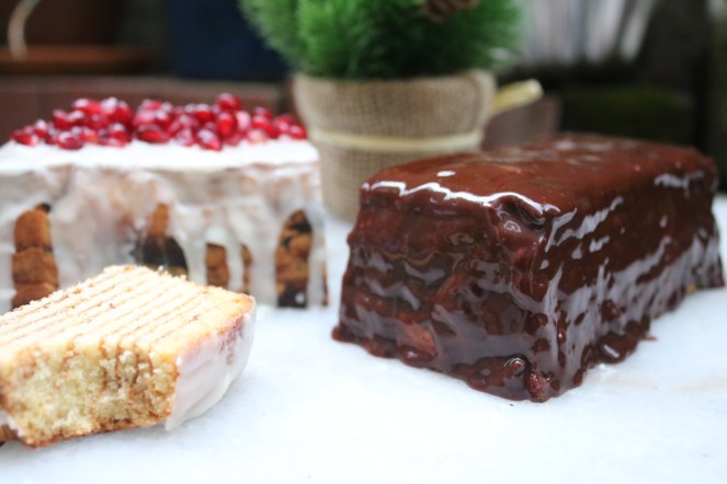 Just melted chocolate, rum, vanilla, corn syrup and butter. My kitchen smelled soo good. I also made a simple powdered sugar, rum and milk glaze for a color contrast.