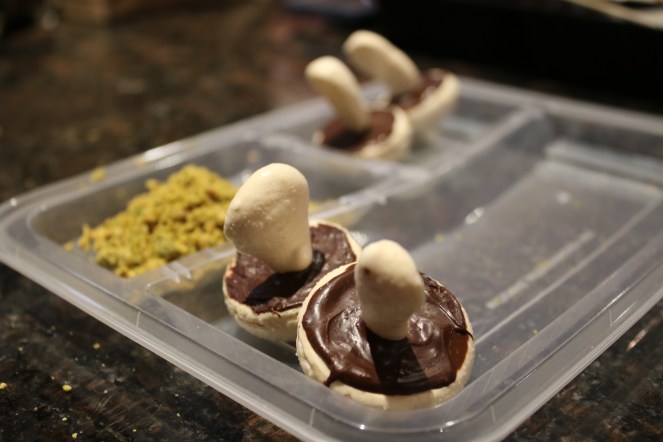 This year, I ground some pistachios for a moss bed and glued my meringues together with dark chocolate. I kept to the classic cocoa powder dirt to make them look a lil more authentic. Such fun-gi(s), always the life of the party.