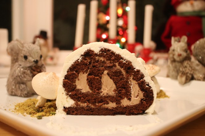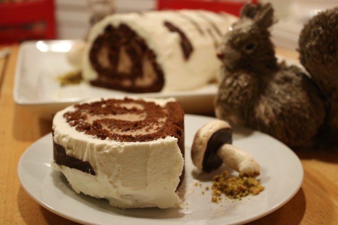 The lovely thing about yule log cakes, is that you can coat the entire outside in delicious frosting and no one needs to know about the huge cracks that betrayed you underneath. I waited about 10 minutes too long to roll it and it cracked in 3 places. Luckily I wasn’t going for a naked finish, so the mascarpone whipped cream worked it’s magic.