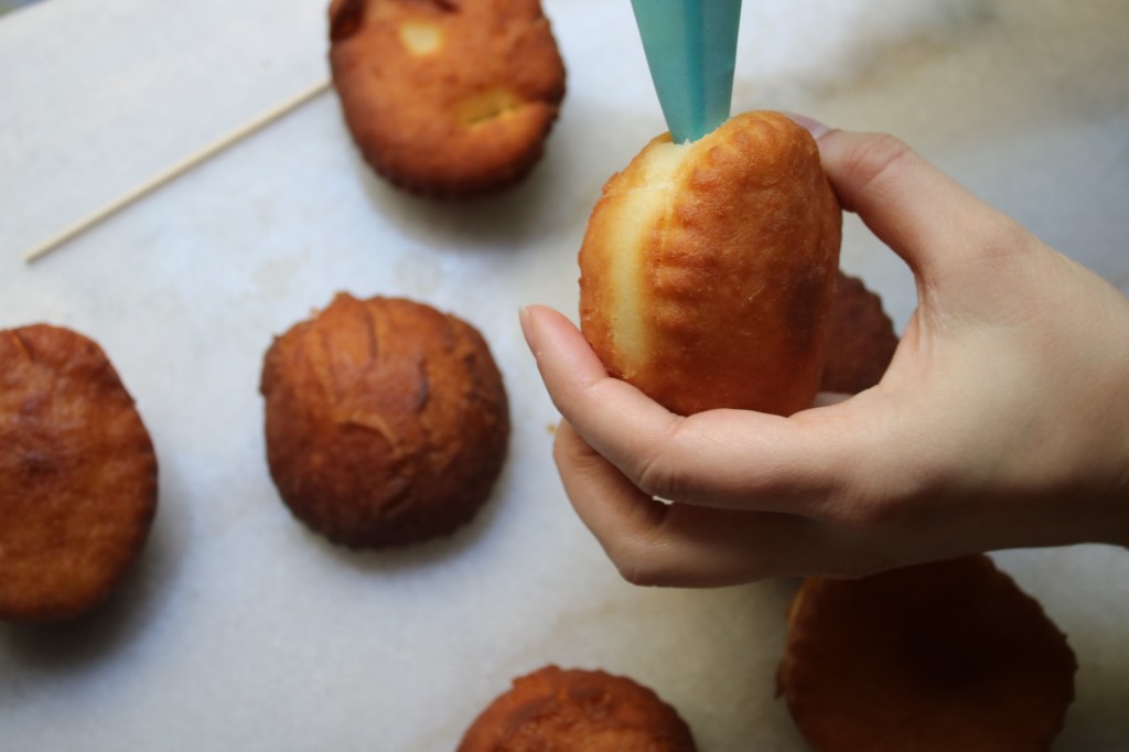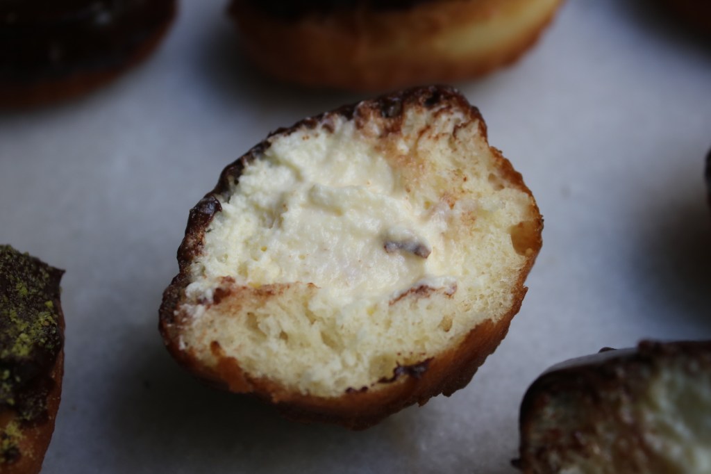 I made some filled and some with holes just for fun, and due to a slight dough mishap, they weren’t as light and airy as I had hoped. Adding a citrus whipped cream filling brought them closer to the fluffy doughnut I was aiming for!