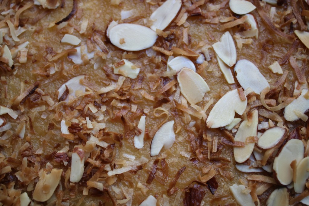 Ooey-gooey slices topped with crispy coconut and sliced almonds. I dare you to eat just one piece! # 159: Coconut Almond Mochi Cake