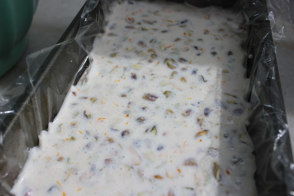 Love the lil orange zest freckles. Mix it all together and freeze in whatever mold or pan strikes your fancy! I cringed at the use of plastic wrap but it I washed it and plan to reuse it once or twice to make it worth it.