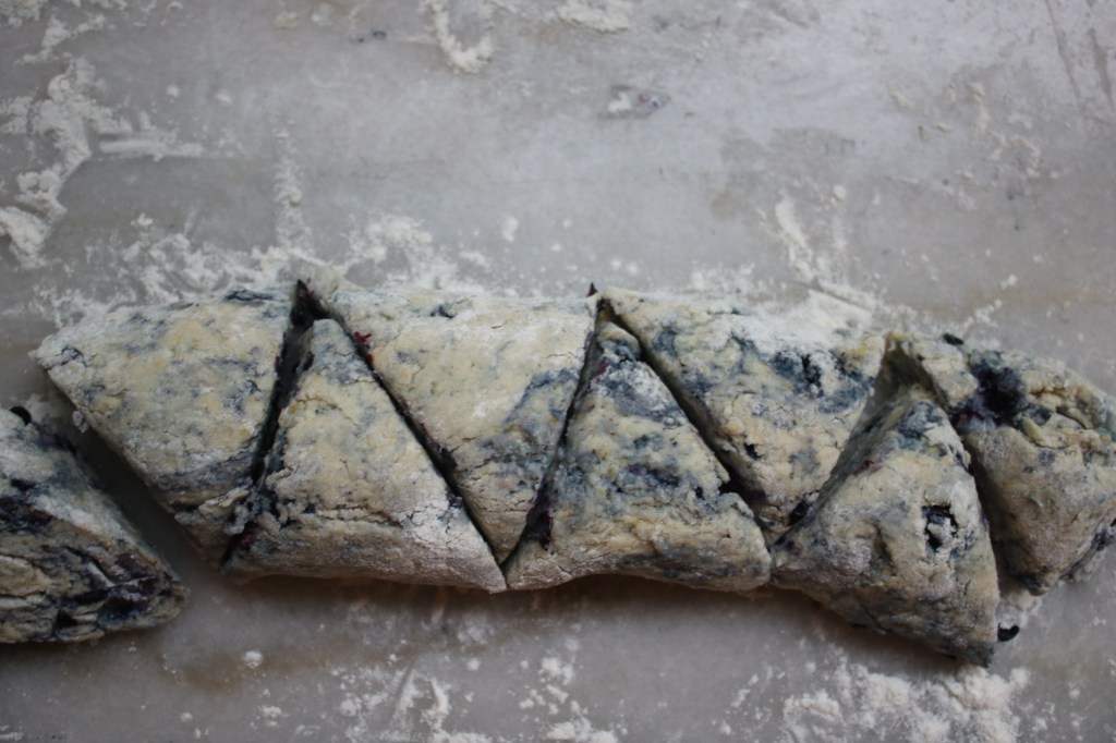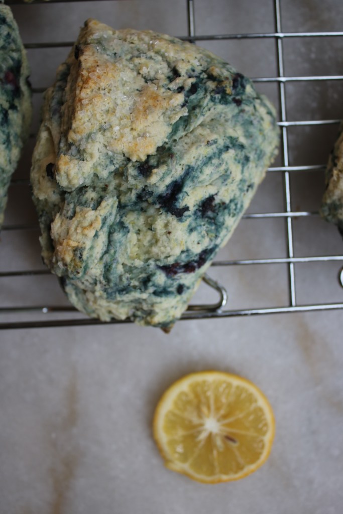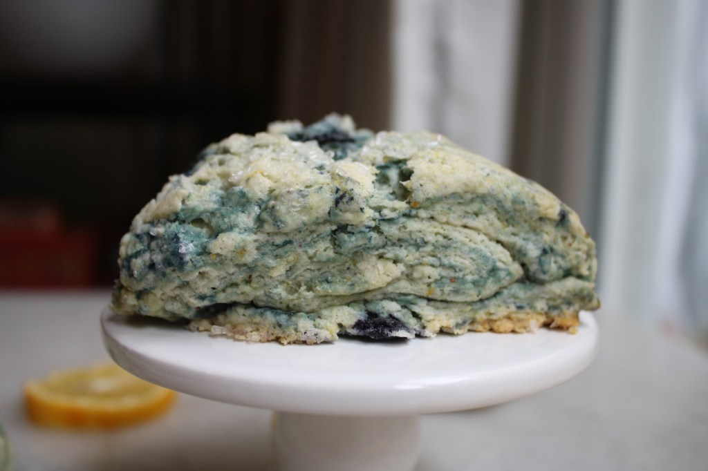 The frozen blueberries I used in the dough added a bit more moisture than I intended so my scones didn’t have the super distinct layers that hers did. But you can kinda see a faint swirl and lemon blueberry is the best combo, so no regrets.