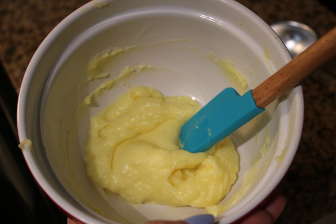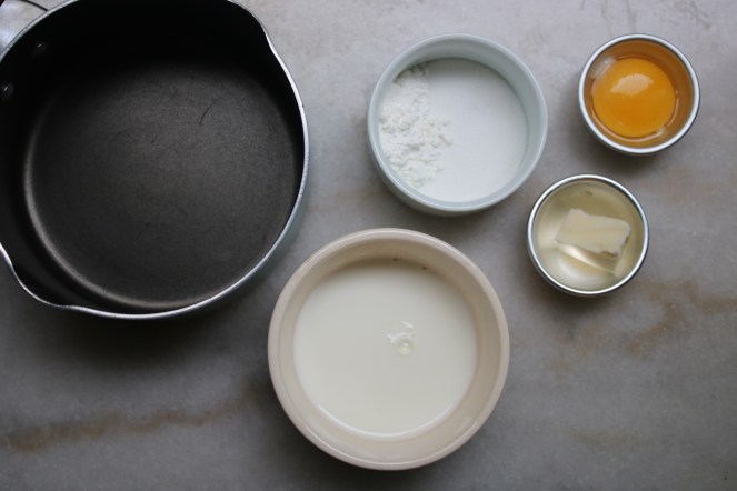 Hot milk slowly added to whisked egg yolk, sugar and corn starch, then cooked over medium heat till thick and velvet-y. Stirring in the butter til it melts and letting it chill in the fridge until it’s time to dress it up for filling pastry! I’d like to go back and tell my past self that pastry cream is 90% easier than it looks and I’d get the hang of it eventually!