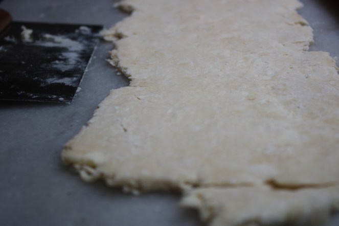 The pastry scraper was perfect for getting the two even folds. First third folded down over the middle, then the bottom third folded up and over. Like folding a 9×13″ piece of paper to put in an envelope!