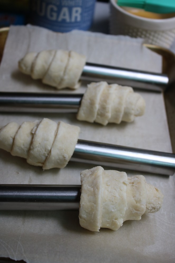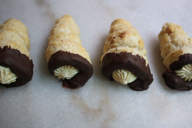Safe to say, they weren’t perfect. The foil point that I made kept popping back into the cylinder when I pressed too hard, sigh. The ring of foil I used to help widen the mouth of the horn got baked into the puff pastry and was a pain to extract. Next time, definitely going to forget about the extra ring of foil – 100% not worth the effort it took to get them out. I could also just make schaumrolle in the future, which are an old Austrian version of the cream horn that doesn’t have a point. Maybe they only had straight cylindrical molds too! Work with what ya got.