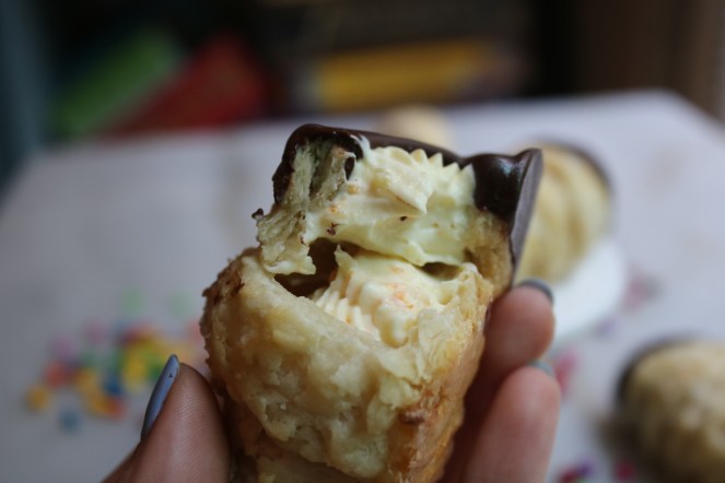 My sister got a cream horn at the Norwegian pavilion at Epcot a few years ago and let me have a bite, and I have to admit I was a tiny bit underwhelmed. There was no chocolate (boo) and the filling was just chantilly cream (whipped cream with vanilla and sugar). It was exactly what it was supposed to be – puff pastry baked in the shape of a horn and filled with cream – but I wanted something more!