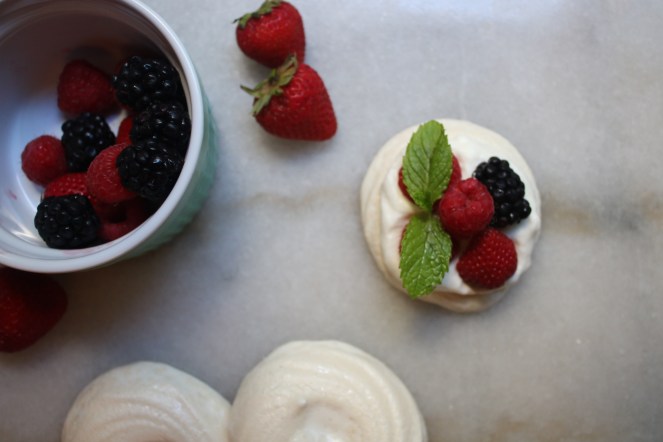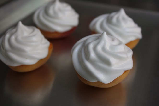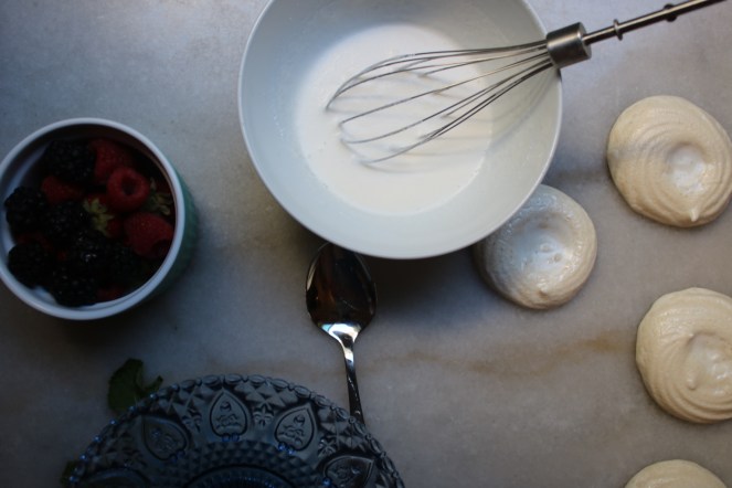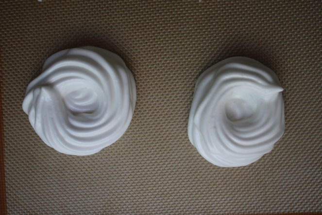 For the pavlovas, I just plopped some of the aquafaba meringue in a piping bag with a fluted tip and piped little swirly baskets on a baking sheet. Then they were whisked off to bake gently at 200F for an hour and a half until crisp.