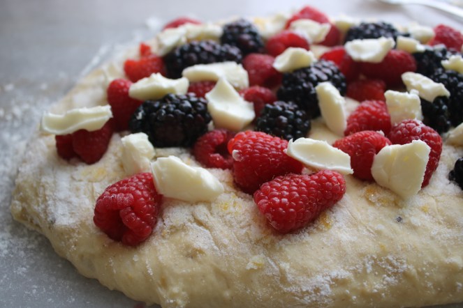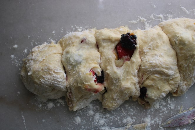 The recipe called for only raspberries, but I’m having a little love affair with in-season blackberries. They’re so juicy and sweet! I’d say branch out and use whatever berries look the yummiest in the produce section. The raspberries in the dough melt into a jam consistency, and it’s as fabulous as you think.