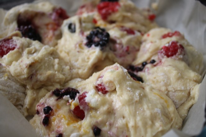 Rolling was a very messy process. The liquid from the berries made the soft dough even more unwieldy, but it eventually came together into a roll! Sliced it up into six rolls and tried to use the force to float them into my pan. When that proved unsuccessful, I put the bench scraper to work.