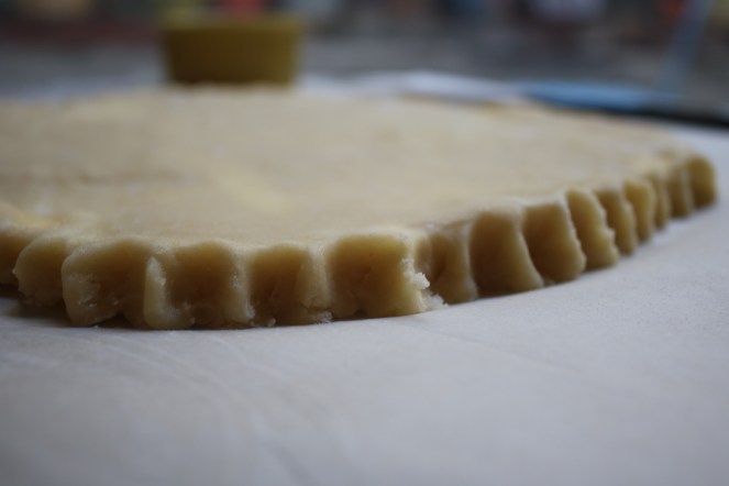 Roll out the chilled dough until it’s about 1/2″ thick. Pinch the edges all around until it looks a bit like a sun.